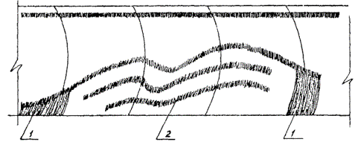 где s - толщина льда, см; d - толщина начальной линии, мм; n - количество измерений. Поправочный коэффициент K находят отдельно для каждого прибора. Для определения толщины ледяного покрова на батиграммной ленте профилографа измеряют толщину начальной линии с точностью до 0,1 мл и умножают на поправочный коэффициент. Разброс K может достигать 15 %. Толщину льда менее 20 см измеряют обычным способам. Подготовка участка измерения глубин через лед7.2. До начала измерения глубин через лед створ размечают мерной лентой на необходимое количество промерных точек, чтобы обеспечить детальность съемки в соответствующем масштабе. Места измерений глубин должны быть обозначены пикетными колышками или вешками. При измерении глубин на значительной площади наиболее простым способом: определения мест промеров является разметка сети квадратов мерной лентой от двух взаимно перпендикулярных линий, обозначенных на местности вехами. Рекогносцировочные обследования реки можно проводить, измеряя расстояния между точками промера по линии хода двумя парами размеченных лыж. Два промерщика последовательно совмещают риски на переднем конце одной пары лыж с концами лыж следующей пары. При этом ведут счет числа перемещений и через заданный интервал измеряют глубину. Относительная точность такого линейного промера 1-200. 7.3. Если в толще ледяного покрова есть воздушная прослойка, измерить длину и толщину льда невозможно, так же как и при пучении льда, когда между нижней кромкой ледяного покрова и водной поверхностью нет непосредственного контакта. При наличии донного льда показания глубин уменьшаются на его толщину. Измерение глубин через лед7.4. В местах промера счищают снег до поверхности льда, к которой затем плотно прижимают вибратор профилографа. Для улучшения контакта вибратора с поверхностью льда на последний наливают 25-50 г воды. Профилограф включают только при условии, если вибратор плотно прижат к поверхности льда. 7.5. Перед началом работы необходимо убедиться, что прибор работает нормально. Для этого измеряют глубину через лед у проруби или лунки. Опустив вибратор в воду, как это делают при обычном промере, производят измерение глубины, подбирают наилучшее усиление зондирующего сигнала. При правильно подобранном усилении на батиграмме получают четкую линию дна, параллельную начальной линии. Затем прибор выключают. Далее вынимают вибратор из воды, плотно прижимают его к поверхности льда и включают прибор. При плавном усилении первый по времени поступления в вибратор сигнал от точки дна на ленте самописца профилографа изображается четкой линией, соответствующей измеряемой глубине. При работе через лед на ленте самописца из-за избыточного усиления обычно пишется не одна, а несколько линий, которые расположены подобно линии дна (рис. 7). Рис. 7. Измерение глубин через лед Для выделения только полезного сигнала от дна необходимо несколько раз плавно изменить усиление, следя при этом за характером появления на самописце отраженных сигналов. При перемене усиления признаком полезного отраженного сигнала является то, что он позже исчезает при уменьшении усиления в записи самописца и раньше появляется при усилении. При наличии воздушной прослойки записи отраженного сигнала на ленте самописца не будет. Предельная толщина льда, через которую изме