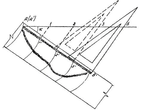 где D - определяемое аналитически расстояние между точками планового обоснования на концах створа. Невязку распределяют пропорционально измеренным расстояниям. По исправленным величинам расстояний наносят промежуточные промерные точки на линию промера в заданном масштабе. 8.8. Обработку измерений расстояний квантовыми дальномерами типа ЕОК-2000 выполняют в поле. Построение палеток8.9. Для каждого скоростемера и профилографа палетка вычерчивается отдельно. В качестве основного деления палетки принимают 1 м, выраженный в установленном по результатам тарирования масштабе. Например, по результатам тарирования 1 м глубины выражается на батиграмме вертикальной ступенью высотой 2,2 мм. Следовательно, для построения палетки раствором измерителя, равным 2,2 мм, откладывают по дуге, описанной радиусом, равным радиусу вращения кругового пера профилографа, деления шкалы палетки через 1 м. При этом достаточно отложить 20 делений, что соответствует 20 м глубины. Наименьшее деление шкалы получают путем деления 1 м в вертикальном масштабе на две части. Таким образом, наименьшее деление шкалы палетки 50 см. 8.10. При отсчете глубин с батиграмм профилографа глазомерно оценивают половину минимального деления палетки. Точность палетки в данном случае составляет около 0,2 м. При использовании профилографа с удвоенной шестерней наименьшее деление палетки составляет 0,1 м. 8.11. В качестве основы для построения шкалы палетки можно применять электротермическую бумагу профилографа, на которой пером прибора чертят дугу. После нанесения на внутренней стороне дуги соответствующих делений электротермическую бумагу обрезают по дуге. 8.14. Палетку для скоростемера изготавливают по результатам тарирования. В качестве основного деления палетки принимают 1 м/с, выраженный в установленном по результатам тарирования масштабе. Например, по результатам тарирования 1 м/с выражается на батиграмме расстоянием 21 мм считая по нормали от линии нулевого отсчета до ступеньки прожига. 8.15. Для построения палетки на прямой линии раствором измерителя, равным 21 мм, откладывают три или четыре деления, которые будут соответствовать целым делениям м/с, т.е. палетка будет рассчитана на отсчет скоростей 3-4 м/с. 8.16. Наименьшие деления шкалы получают путем последовательного деления 1 м/с на две части и т.д. до получения минимального деления, равного 0,12 м/с. Практически при разметке делений можно ограничиться разбивкой прямой до наименьшего деления, равного 0,25 м/с, и при отсчете скоростей половину минимального деления оценивать на глаз, т.е. с точностью до 0,1 м/с. 8.17. В качестве основы для построения палетки можно использовать любую плотную бумагу или счетную линейку. План глубин и скоростей течений8.18. Плановая основа промера может быть вычерчена на любом листе плотной бумаги. Масштаб изображения должен быть возможно крупнее: чем крупнее масштаб, тем легче последующая камеральная обработка. При ширине реки более 1000 м основной базис предпочтительно задавать в масштабе 1:5000. При уменьшении ширины менее 1000 м следует переходить к более крупным масштабам (1:2000 и крупнее). Удобно выполнять графические построения плановых засечек на рулонной миллиметровой бумаге. 8.19. Плановые точки промера, наносимые по углам засечек, обозначают на плане наколом циркуля и карандашом проставляют порядковый но