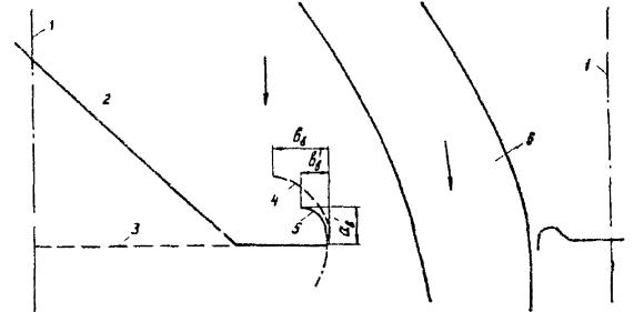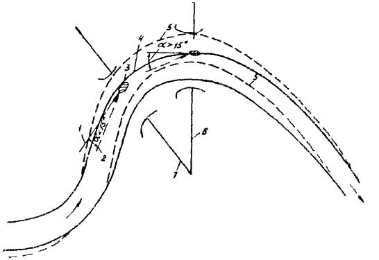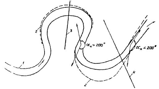 спрямляющем протоке следует отдавать предпочтение при Рис. 1. Пересечение свободно меандрирующих русел: 1 - положение русла во время изысканий переходов; 2 - положение деформируемых берегов за период эксплуатации перехода; 3 - пересечение старой излучины; 4 - то же развивающейся излучины 1.7. Створ перехода через реки с ограниченно меандрирующими руслами желательно назначать ближе к середине излучины к низовой ее половине. 2. РАЗМЕЩЕНИЕ И НАЗНАЧЕНИЕ ОТВЕРСТИЙ2.1. На переходах через меандрирующие русла отверстие моста следует назначать не менее ширины разработанного русла на пересекаемой излучине. 2.2. При необходимости устройства пойменных пролетов пойменную часть отверстия желательно назначать со стороны выпуклого берега, к которому примыкает мощная пойма. Увеличение отверстия в сторону выпуклого берега при мощной пойме у вогнутого не рекомендуется, так как это вызовет удорожание перехода за счет устройства дополнительных сооружений для включения в работу пойменной части отверстия со стороны выпуклого берега. 2.3. На переходах через свободно меандрирующие русла пойменная часть отверстия со стороны вогнутого берега должна быть не менее ширины смещения береговой линии в створе перехода. При этом ось русла в отверстии за время эксплуатации перехода не должна отклоняться от своего первоначального положения более чем на 15° (рис. 2). Рис. 2. Назначение пойменной части отверстия моста у вогнутого берега с учетом плановых деформаций свободно меандрирующего русла: 1 - направление руслового потока до деформации берегов; 2 - то же после деформации; 3 - опора; 4 - положение берега на момент постройки моста; 5 - то же после деформации; 6 - размещение отверстия, при котором угол набегания потока на опору в процессе эксплуатации меняется более чем на 15°; 7 - то же, при изменении угла менее 15° Расчет плановых деформаций свободно меандрирующих русел приведен в пп. 2.6 - 2.9. 2.4. На переходах через реки с ограниченно меандрирующими руслами при интенсивном русловом процессе, когда за время эксплуатации моста сползание излучины будет более половины ее шага, отверстие моста можно назначать с минимально возможным перекрытием поймы (из условия размывов под мостом). При этом требуется закреплять подмываемые вогнутые берега верховой и пересекаемой трассой излучин (рис. 3). Рис. 3. Схема перехода через реку с ограниченно меандрирующим руслом: 1 - трасса перехода; 2 - закрепление вогнутых берегов излучин; 3 - положение русла во время изысканий перехода; 4 - то же после прогнозируемого смещения Для малых и средних рек с узкой глубокой долиной возможен вариант перекрытия мостом всего пояса меандрирования. В этом случае размываемые вогнутые берега не укрепляют. 2.5. Размер отверстия моста на искусственном русле (при свободном меандрировании) и спрямляющем протоке (при незавершенном меандрировании) не должен быть менее ширины разработанного русла на прямом участке реки. На спрямляющем протоке может быть рассмотрен вариант моста на ширину русла с закрепленным подмостовым сечением. Рекомендации по расчету укреплений подмостового русла приведены в работе [3]. Темп смещения береговой линии следует определять совмещением двух разновременных съемок нескольких излучин русла. На основании этих данных среднюю скорость смещения находят по формуле