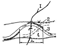 В силу значительного изменения Киз от угла разворота излучины au и отношения S/λu расчет по формулам (2) - (4) выполняют, разделяя период Т лет на отрезки времени по 10 - 30 лет в зависимости от величины С и срока прогнозирования. Расчет и построение линии деформированного берега производят сначала для первого отрезка времени и определяют конечное значение au или S/λu, для которых по табл. 1 находят новое значение Киз. Затем производят расчет и построение линии деформации берега для следующего отрезка. 2.9. При ограниченном меандрировании русла происходит смещение вниз по течению пологих излучин (au ≈ 60°) без изменения их плановых очертаний. Среднее смещение излучин определяют по формуле где qиз - средний за расчетное время погонный расход наносов в излучине русла, кг/с×м; определяют согласно рекомендациям НИМП-72 [4]; Трасч - расчетное время, в течение которого при среднем (Р = 50 %) паводке средняя скорость течения в русле превышала неразмывающую, с; g - объемная масса грунта в естественном залегании, кг/м3; Нл - средняя за расчетное время глубина воды в плесовой лощине на протяжении вогнутого берега. 2.10. Пример. Определить наиболее рациональное положение трассы мостового