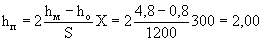 Согласно НИМП-72 (см. гл. X) при δ = 0,305 соотношение полуосей дамбы К = 1,83. Тогда а′в = Кb′в = 1,83 × 55,5 = 101,5 м. Как видно из приведенного расчета, при косорасположенном подходе размеры дамб сокращаются (при пересечении подхода долины под прямым углом размеры верховой струенаправляющей дамбы получены bв = 62,5 м, ав = 125 м). Пример 2. Для условий примера 1 рассчитать скорости вдоль правобережного подхода и определить, какие силовые факторы (волновые воздействия или продольные скорости) являются определяющими при назначении укрепления откосов насыпи. Коэффициент заложения откоса насыпи m = 2, расчетная высота волны hв = 0,30 м, длина λ = 2,8 м. Определим скорость вдоль насыпи в точке А (см. рис. 12), которую пересекает пойменное живое сечение при X = 1200 м в следующей последовательности. 1. Определяем по плану ширину живого сечения. Получим Вп = 950 м. 2. Находим, насколько отметка уровня в рассматриваемом живом сечении выше уровня до стеснения. Так как 1200 > Х0 = 512 м, то указанное превышение находим из формулы (28) Dhв - 3. Определяем глубины потока: среднюю в русле на расстоянии X = 1200 м от оси моста Нрх, на бровке русла Нпх и у насыпи hнас. Эти глубины потока увеличились по сравнению с бытовыми условиями на 0,06 м. Тогда Нрх = 7,0 + 0,06 = 7,06 м, Нпх = hнас = 1,9 + 0,06 = 1,96 м (в примере принято, что отметки поверхности участка поймы практически одинаковые). 4. Рассчитываем по формуле (29) скорости потока на бровке русла с глубиной Нпх = 1,96 м. Предварительно по формуле (25) определим расход в русле на расстоянии X = 1200 м от моста. По расчету получаем (см. п. III примера 1) Qpx = 1320 м3/с, что меньше 0,8Qрб. Поэтому принимаем: Qpx = 0,8Qpб = 0,8 × 2630 = 2100 м3/с;