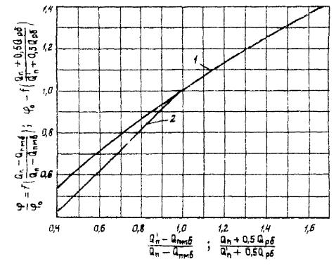 = j0 где j0 - коэффициент, учитывающий наличие пойм в створе перехода: при односторонней пойме j0 = 1; двусторонней пойме j0 = Qрб, Qп и Qпмб - расход воды, проходящей в оптовых условиях соответственно в русле, на пойме (косопересекаемой подходом) и на ширине пойменной части отверстия со стороны рассматриваемой поймы; Q′п - расход воды, проходящей в бытовых условиях по рассматриваемой пойме и регулируемой струенаправляющей дамбой (см. п. 3.5); z - показатель степени, принимаемый для двусторонней поймы 0,685, односторонней 0,95. Рис. 5. Параметры струенаправляющих дамб: 1 - граница разлива; 2 - положение пойменного подхода, направленного вверх по течению; 3 - то же при нормальном переходе; 4 - струенаправляющая дамба при нормальном переходе; 5 - то же при косом переходе; 6 - русло Для определения коэффициентов j и j0 рекомендуется пользоваться графиком (рис. 6). Рис. 6. График для определения j и j0 1 - двусторонняя пойма; 2 - односторонняя пойма Соотношение полуосей эллиптической дамбы 3.5. При определении величины пойменного расхода, регулируемого дамбой, необходимо учитывать, что подход, направленный вверх по течению, отжимает пойменный поток в русло. Поэтому струенаправляющая дамба регулирует только часть пойменного потока Q′п, определяемого в зависимости от пойменных частей отверстия: при отсутствии пойменной части отверстия (мост перекрывает только русло) Q′п = Qп - R′п Q′рб; (8) при односторонней пойменной части отверстия Q′п = Qп - Q при двусторонней пойменной части отверстия где μ = Qп - Q j = Q - расход воды в расчетный паводок; Qп(в) - расход воды, проходящей в бытовых условиях на пойме, которую трасса пересекает нормально пойменному потоку; R′п - коэффициент уменьшения загрузки пойменной части отверстия со стороны подхода, косорасположенного к пойменному потоку; R′п = 0,15 δп, (13) δп - коэффициент продольного стеснения поймы (см. п. 3.6); R - коэффициент увеличения руслового расхода в отверстии моста по сравнению с бытовыми условиями, определяемый по формуле [5] Здесь vрб, vб - средняя скорость потока при отсутствии стеснения соответственно в русле и по всему живому сечению; g - ускорение силы тяжести; iб - продольный уклон водной поверхности нестесненного потока; Lразл - расчетная ширина разлива; при одностороннем стеснении потока принимается равной полной ширине разлива, при двустороннем - половине ширины разлива; a - коэффициент, принимаемый в зависимости от стеснения потока по табл. 9 гл. VIII НИМП-72; Dhв - предмостовой подпор Здесь vм, vбм - средние скорости потока соответственно под мостом и в части живого сечения на ширине моста при отсутствии стеснения; К - коэффициент, определяемый по зависимости