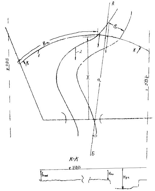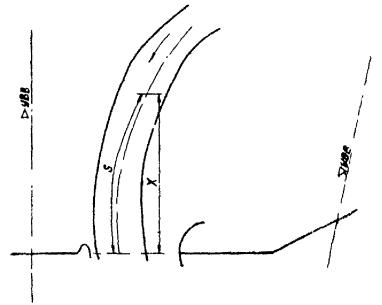 где Lм - отверстие моста; Х - расстояние от оси моста до рассматриваемого сечения (рис. 8); Qрм - расход воды, проходящей в русловой части отверстия моста Qрм = Qрб R; (24) Qрх - расход воды, проходящей в русле на расстоянии X от оси моста вверх по течению1; Qрх = gиз Qрм gиз - коэффициент, учитывающий извилистость русла, gиз = (1 ÷ 0,85) δиз - коэффициент извилистости русла, равный отношению длины русла S от рассматриваемого сечения до оси перехода к кратчайшему расстоянию Х между этими сечениями русла (см. рис. 8); ΣQпх - расход в пойменных живых сечениях, находящихся на расстоянии X от отверстия ΣQпх = Q - Qpх (26) 1Формула (25) применима при любых получаемых значениях Qрх только для расчета радиусов кривизны пойменных живых сечений. При расчете скоростей на пойме, если по формуле (25) получится Qpх < (0,8 ÷ 0,9) Qрб, то принимают Qpх = (0,8 ÷ 0,9) Qpб. Рис. 8. Определение коэффициента извилистости русла δиз Для быстрого определения радиусов кривизны пойменных живых сечений рекомендуется пользоваться графиком (рис. 9). Рис. 9. График для определения радиусов кривизны пойменных живых сечений r 3.8. Плановое положение пойменных живых сечений на плане участка реки с мостовым переходом определяют в следующей последовательности (рис. 10): находят на плане положение вертикали по оси русла, расположенной на расстоянии X от моста; через указанную вертикаль проводят линию АБ, параллельную (или совпадающую) с траекторией поверхностных токов в русле при расчетном паводке1; 1 Предполагается, что траектории поверхностных токов в русле при стеснении и в бытовых условиях практически совпадают. на проведенной линии откладывают расстояние (в соответствующем масштабе), равное подсчитанному радиусу r; конец отрезка (точка 0) является центром кривой (окружности), по которой описывают пойменное живое сечение на расстоянии X от моста. Рис. 10. Нанесение пойменного живого сечения на план участка: 1 - пойменное живое сечение на расстоянии X от оси моста; 2 - траектории поверхностных токов в русле 3.9. Для гашения скоростей потока вдоль подходной насыпи на пойме следует применять сплошные прямолинейные незатопляемые траверсы. Их плановые размеры, местоположение и число определяют согласно рекомендациям НИМП-72, а в сложных гидроморфологических условиях - на основе физического моделирования. Преимущество поперечных сооружений перед укреплением откосов необходимо обосновывать технико-экономическим расчетом. Для проведения этого расчета необходимо знать: скорость потока вдоль подходных насыпей в расчетный паводок (при отсутствии поперечных сооружений); параметры расчетной волны, воздействующей на подходную насыпь, которые определяют согласно СНиП II-57-75 [6]. 3.10. Скорости потока вдоль пойменной насыпи определяют в следующей последовательности: 1. По нанесенному на план пойменному живому сечению (согласно п. 3.8) определяют ширину этого сечения Вп (см. рис. 10). 2. Находят отметку свободной