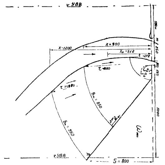 Тогда коэффициент извилистости русла δиз = Qрх = 3510 По формуле (26) расход в пойменных живых сечениях, находящихся на расстоянии X = 800 м от отверстия, равен ΣQпх = (3627 - 1880) = 1747 м3/с. При След пойменного живого сечения с r = 1090 м наносим на план. По плану видно (см. рис. 12), что искомое живое сечение должно находиться выше по течению, чем нанесенное на план. Задаемся рядом значений Х > 800 м и наносим полученные