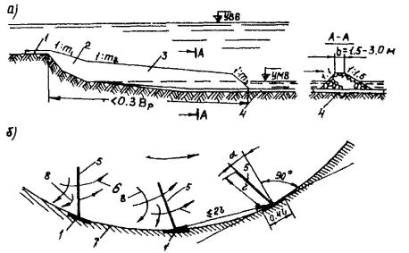 Левая часть неравенства (37) 4. РЕГУЛИРОВАНИЕ РУСЛОВОГО ПОТОКА4.1. Регулирование руслового потока в районе мостового перехода имеет целью предотвратить деформации, которые могут привести к нарушению нормальной работы перехода. К основным мероприятиям по регулированию руслового потока на мостовых переходах через меандрирующие русла относятся: спрямление русла и отвод протоков в русле реки; предотвращение плановых деформаций русла в районе мостового перехода. 4.2. Необходимость в спрямлении русла возникает при расположении моста на спрямляющем протоке (при незавершенном и свободном меандрировании и отводе русла с целью выключения излучины, угрожающей подходам (рис. 13). Примечание. Спрямление излучин русла в районе мостового перехода иногда производят с целью ликвидации условий образования заторов льда при ледоходе в сильно развитых излучинах. При пересечении трассой мостового перехода протоков последние должны отключаться перед подходной насыпью и отводиться в русло. Примечание. Подходы к мостам могут пересекать староречья, ложбины между старыми прирусловыми валами и другие пониженные места, в которых накапливаются талые и грунтовые воды. Если при этом паводочные воды заболачивают эксплуатируемые пойменные земли, то в проекте должны быть предусмотрены водоотводы из пониженных мест. Рис. 13. Схема спрямлений излучен русла: а - спрямляемая излучина, угрожающая пойменной насыпи; б - расположение моста на спрямленном русле: 1 - спрямление; 2 - запруда; 3 - укрепление берега: 4 - граница разлива при УВВ Предотвращение деформаций русла (в плане) обеспечивается укреплением берегов и устройством поперечных сооружений. Длину участка защитного фронта назначают согласно рекомендациям НИМП-72, а в сложных условиях - на основе физического моделирования. Для сокращения затрат на регулирование потока в меандрирующих руслах следует комбинировать поперечные сооружения и укрепления берегов, применяя последние вблизи перехода. 4.3. Спрямление русла следует проектировать шириной Вспр и глубиной Нспр в пойменных бровках соответственно равными: Вспр = Вр ´ Кспр; (39) Нспр = Нр Кспр; (40) Вспр = где Вр, Нр - соответственно ширина и средняя глубина русла в его пойменных бровках; nиз, nспр - коэффициенты шероховатости русла соответственно в пределах излучины и спрямленного русла; Lиз, Lспр - длина русла соответственно по излучине и на спрямленном участке. Прямолинейный участок спрямленного русла сопрягается с бытовым руслом по круговым кривым, радиус которых на несудоходных и несплавных реках должен быть больше 3,5 Вспр, на судоходных и сплавных - не менее 5 Вспр. Примечание. Заменять спрямление русла устройством пионерной траншеи не рекомендуется вследствие возможного неорганизованного размыва прорези. Для заиления выключенной излучины русла на уровне бровок русла устраивают перемычки - массивные запруды в начале и конце спрямленной излучины. На несудоходных и несплавных реках, когда отверстие располагают не на спрямлении, перемычку разрешается устраивать только в нижнем по течению участке спрямляемой петли. Рекомендации по размещению запруд даны в работе [1]. 4.4. С целью сокращения объема работ отвод из протока в русло рекомендуется рассчитывать с учетом саморазмыва пионерной траншеи. Размеры пионерной траншеи выбирают согласно рекомендациям р
