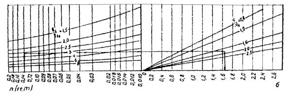 М - коэффициент формы укрепления, равный единице для укреплений откосного типа без фундамента (например, каменная наброска) и вертикальных стенок или других подобных укреплений с крутизной относа m £ 0,5, и М = 1,2 для откосного типа укреплений при m > 0,5 с вертикальной внешней гранью фундамента (к такому укреплению относятся, например, подпорные стены с противоразмываемым зубом или глубоким фундаментом); vc - размывающая скорость для грунтов, слагающих русло, при средней глубине потока излучины Н; определяют по формуле (36); R = n - коэффициент шероховатости укрепления, определяемый в зависимости от материала укрепления: Материал укрепления Коэффициент шероховатости Бетонная затертая поверхность...................................................... 0,011 - 0,015 Кирпичная кладка, покрытая цементным раствором................... 0,012 - 0,017 Бетонная неотделанная поверхность............................................. 0,013 - 0,020 Бутовая кладка.................................................................................. 0,018 - 0,030 Габионная кладка............................................................................. 0,025 - 0,030 Каменная наброска.......................................................................... 0,030 - 0,045 Для быстрого определения Пример. Определить наибольшую глубину размыва у вогнутого берега излучины, укрепленного каменной наброской. Каменная наброска укладывается с откосом m = 2,5. По карте определили ширину излучины в бровках Bбр = 75 м со средним радиусом кривизны Rс = 200 м. Русло со средней глубиной в бровках Н = 1,8 м пропускает расход Q = 300 м3/с. Русло сложено песком с примесью гравия; средний диаметр грунта d = 6 мм. По рис. 15 определяем коэффициент s. Предварительно для каменной наброски принимаем n = 0,04. Средняя скорость потока в излучине