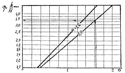 4.8. При проектировании укреплений следует учитывать, что в связи с предотвращением естественного хода руслового процесса по подошве укрепленного откоса возникают размывы. Глубину воронки размыва, считая от поверхности подошвы вогнутого берега, определяют по формуле Dh = ηH - h, (46) где η - отведение глубины потока у вогнутого берега после размыва hmax к средней глубине потока Н в рассматриваемом створе излучины, определяемое по формуле η = 0,67 еМs. (47) Здесь