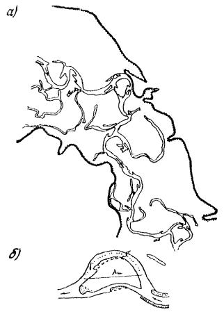 (2,5 + 1) = 0,14; С учетом того, что для каменной наброски коэффициент формы М = 1 по рис. 16 определим η = 3,45. По табл. 7 при Рис. 15. Номограмма для определения s По формуле (46) получим глубину воронки размыва у укрепления Dh = 3,45 × 1,8 × 4,85 = 1,35 м. Рис. 16. График для определения η ПриложениеПРИЗНАКИ И ОСОБЕННОСТИ МЕАНДРИРУЮЩИХ РУСЕЛМеандрирование русел возникает на участках равнинных рек с достаточно широкими поймами и хорошо размываемыми грунтами, подстилающими долину. Под меандрированием понимается процесс изменения планового очертания русла, которое характеризуется следующими параметрами: au - угол разворота излучины, равный сумме углов входа и выхода из излучины au = aвх + aвых; S - длина излучины, равная расстоянию между верховой и низовой точками перегиба излучины вдоль средней линии русла; λu - шаг излучины, равный кратчайшему расстоянию между верховой и низовой точками перегиба (по оси русла); ru - радиус кривизны, измеряемый в случае асимметричного развития излучины отдельно для участка каждой плесовой лощины. Гидравлические характеристики потока, морфологические особенности русла и долины определяют интенсивность и закономерности плановых переформирований русла, т.е. тип руслового процесса. По классификации Государственного гидрологического института (ГГИ) различают три типа меандрирования русла: свободное, незавершенное и ограниченное.1 1 В литературе встречается четвертый тип меандрирования русла - вынужденное, когда русло зажато с двух сторон неразмываемыми бортами долины и повторяет поэтому все повороты узкой долины. Свободное меандрирование русла наблюдается на сравнительно небольших равнинных реках, имеющих широкие поймы, при которых ширина долины превышает ширину пояса меандрирования, т.е. ширину поля, ограниченного линиями, соединяющими вершины одинаково направленных излучин. Характерная особенность свободного меандрирования состоит в том, что каждая излучина проходит определенный цикл развития. В начальный период еще слабо выраженная излучина имеет тенденцию сползать вниз без изменения своей формы. Но этому препятствуют выше и ниже расположенные излучины. Поэтому процесс плановых деформаций происходит за счет разворота излучин вокруг точек перегиба оси русла (рис. 1). В результате угол разворота au увеличивается и излучина принимает округлые очертания. Вследствие разворота верховой и низовой излучин происходит сближение их вогнутых берегов. В один из паводков при выходе воды на пойму происходит прорыв излучин в месте кратчайшего расстояния между ними (перешейком). Средняя излучина отделяется от нового русла, образуя старицу, которая имеет в плане характерную серповидную форму. Наличие на пойме большого количества стариц серповидной формы (см. рис. 1) является отличительной особенностью рек со свободным меандрированием. Сравнительно узкая долина с трудно размываемыми берегами ограничивает развитие излучин. В этих случаях тип руслового процесса, протекающего в русле, называется ограниченным меандрированием. При этом типе руслового процесса русло имеет слабо извилистую форму с углом разворота au не более 70°, основные переформирования русла заключаются в сползании излучин вниз по течению без существенных их плановых очертаний и размеров (рис. 2). Незавершенное меандрирование наблюдается на реках, имеющих шир
