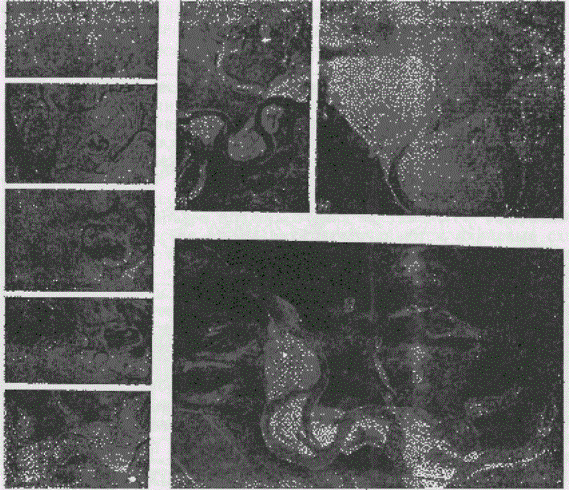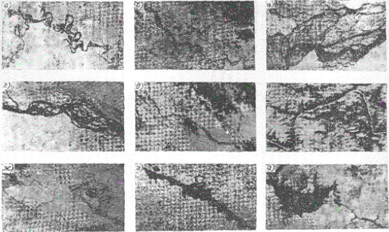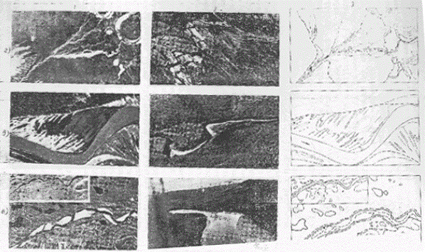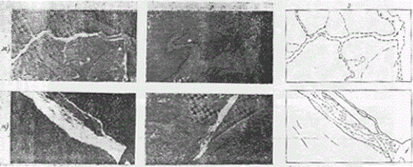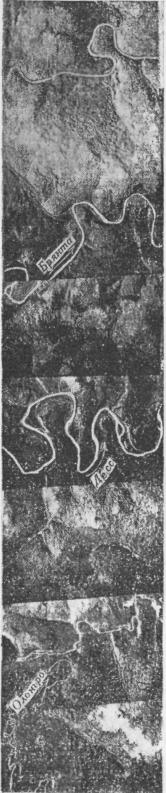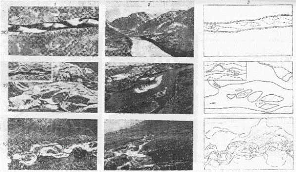 Однозначное опознание большинства типов русел на участках рек можно выполнить только по аэрокосмическим материалам. Результаты анализа изображаются обычно на карте-схеме, за основу которой берется карта чаще всего масштаба 1:2500000 [2, 35, 40]. На этой основе (с соответствующей дорисовкой малых рек) создаются серии карт-схем: а) фиксирующих современное состояние рек (фрагмент подобной карты-схемы приведен на вкл. рис. 4); б) показывающих изменение типов руслового процесса под влиянием антропогенного воздействия, т.е. восстанавливающих по аэрокосмическим материалам состояние рек до антропогенного вмешательства; в) выявляющих участки рек, подлежащие охране. Применением аэрокосмических материалов обеспечивается объективность, точность и полнота содержания карт-схем. Одновременно с составлением карт-схем дается описание региональных особенностей проявления типов руслового процесса. Для их выявления составитель карты-схемы должен участвовать в полевых (наземных) изысканиях на реках региона и знакомиться с опубликованными работами по региону в смежных областях науки. Подробные карты-схемы для отдельных регионов выполняются в масштабе 1:1000000. Для обеспечения более полной насыщенности карты-схемы информацией используются материалы аэрокосмических съемок, рабочие масштабы которых в 5-6 раз крупнее масштаба карты-схемы. Рис. 4. Фрагмент карты-схемы типов руслового процесса на реках зоны БАМ. 1 - свободное меандрирование; 2 - незавершенное меандрирование; 3 - пойменная многорукавность; 4 - склоновая многорукавность; 5 - русловая многорукавность; 6 - горная русловая многорукавность; 7 - наледная многорукавность; 8 - вынужденное меандрирование; 9 - сток по мари. Данные об изменении плановых характеристик долин, пойм, русел и русловых форм по длине рек извлекаются с фотопланов, уточненных фотосхем или с контактных отпечатков, масштаб которых уточняется по картам. Одновременно с измерением плановых характеристик высказываются предположения о причинах изменений, обусловливающих переход от одного типа руслового процесса к другому. Для обеспечения полноты анализа выявленных изменений морфологических характеристик привлекаются данные о высотных характеристиках тех же морфологических образований, устанавливаемые по картам и при наземном обследовании. Динамика заполнения и опорожнения пойм на таких крупных реках, как Обь, Волга, Амур, может быть выявлена по ТВ-снимкам среднего разрешения - МСУ-С. В случае недостаточного количества снимков к анализу привлекаются ТВ-снимки малого разрешения - МСУ-М. Контуры разливов по тем и другим снимкам в общем совпадают, но детальность изображения внутри этих контуров неравноценна [11]. При дешифрировании используются данные об уровенном режиме, гидроморфологическое описание участка реки, подробные сведения о пойме, различные карты. В некоторых регионах ко времени паводка почти всегда приурочена сплошная облачность и летно-съемочные работы не выполняются. В этом случае хорошие материалы по затоплению пойм можно получить с помощью радиолокационной съемки. При определении плановых деформаций (скорости размыва и намыва) подбираются материалы многократных последовательных аэрокосмических фотосъемок (рис. 5). Рис. 5. Фрагменты аэрофотоснимков участка реки разных масштабов, дат съемки, различного качеств