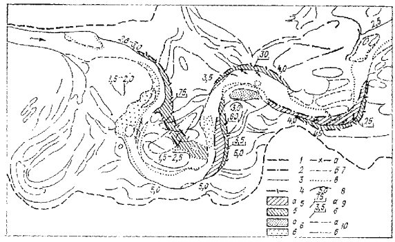 На одной и той же стадии развития излучины плановые деформации различны в маловодные и многоводные годы. При низких уровнях они незначительны, а при высоких - могут возрасти на порядок, т.е. за один паводок могут произойти обрушения берегов, превышающие смещение берегов за весь период между съемками. Путем последовательного совмещения снимков выявляются размеры плановых деформаций при разных уровнях (расходах), выделяются уровни (расходы), при которых возможны максимальные обрушения (см. пример выполненного совмещения). Прогноз смещений обрушаемых берегов можно выполнить по формуле Н.Е. Кондратьева ΔBб = Kи ТСи макс [(hмакс - hср) / (hпл - hср)], (4.4) где ΔВб - смещение бровки подмываемого вогнутого берега излучины за расчетный период времени Т лет, м; Си макс - наибольшая в пределах данной излучины осредненная за период скорость смещения бровки вогнутого берега, м/год; hмакс - наибольшая глубина русла в расчетном створе, м; hср - средняя глубина на гребнях двух смежных перекатов, ограничивающих излучину и расположенных и местах перегиба ее средней линии, м; hпл - наибольшая глубина русла в плесе излучины, м [33]. На участке
