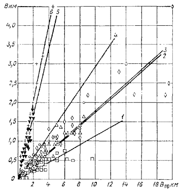 Зависимости Си макс = f(Н) и Q = f(H), 1 - максимальные скорости плановых деформаций (размывы), м/год; 2 - измеренные расходы. За период 1976-1981 гг. путем совмещения снимков 4 и 8 выявляются значительные изменения на участке (см. рис. 6). Обрушения, достигающие 60 м, относятся за счет паводка 1980 г., уровни и расходы которого значительно превышают все измеренные за период наблюдений. Значительные изменения за период 1948-1976 гг., используя данные об уровнях по реке-аналогу, можно отнести к паводку 1962 г., уровни которого близки к уровням в паводок 1980 г. Максимальное значение скорости смещения бровки берега, осредненное за этот период, составляет 3,5 м/год. Снимки 1 и 8 дают основные сведения о переформированиях на участке, происшедших за период 1948-1981 гг. Эти снимки низкого качества, совмещение с ними выполнено методом наилучшего совпадения. В анализ включены также материалы космического фотографирования, полученные в маловодные 1973 и 1975 гг. (1а и 1б). Совмещение схем, полученных с этих снимков, подтверждает отсутствие изменений на участке за эти годы. Совмещение и визуальная оценка выявили отсутствие намыва пляжей. За 33 года пляжи не заросли, что указывает на то, что в паводки происходит транзит наносов по всей площади пляжей. Не выявлено и изменений на пойме, так как выделенные контурные линии на пойме сохранились неизменными за весь период между съемками. 4.3. Оценка погрешностей совмещенияВ основу выполняемых совмещений положена предпосылка о том, что смещение бровок берегов фиксируется определенно только при смещении не менее 1 мм. Точность определения скорости плановых деформаций зависит от смещения, которое в свою очередь определяется скоростью плановых деформаций на участке реки, выбором масштаба совмещения, интервалом времени между съемками. При значительных обрушениях, например 200 м/год, смещение линии обрушаемого берега будет равно 1 см при совмещении в масштабе 1:20000 и с интервалом в 1 год между съемками. При незначительных обрушениях, например 2,0 м/год, нужен 10-летний период между съемками и масштаб совмещения 1:2000, чтобы получить ту же точность определения скорости плановых деформаций. При малом смещении линий (контуров) подмываемых берегов, близком к 1 мм, погрешность при определении плановых деформации будет значительной. Необходимо напомнить, что 1 мм при масштабе 1:2000 составляет 2 м; 1:10000 - 10 м; 1:15000 - 15 м и т.д. Ясно, что при увеличении масштаба совмещения (путем фотоувеличения, предельно использующего разрешающую способность снимков-негативов) происходит возрастание значения смещения линий. Увеличивается значение смещения и при привлечении картографических материалов за более ранние даты - этим удлиняется период между съемками. За счет увеличения значения смещения такими путями резко снижается погрешность при определении плановых деформаций. Погрешности при определении плановых деформаций могут появиться и за счет допущенных неточностей при: монтаже фотосхем, использовании малоконтрастных снимков, графическом исполнении схем, выполнении совмещения снимков, определении масштаба совмещенных схем. Неточности монтажа фотосхем не повлекут за собой погрешностей при определении плановых деформаций, если совмещение выполняется только по общим частям тех кадров, из которых смонтированы фотосхемы. Для уменьшения неточностей совмещения ма