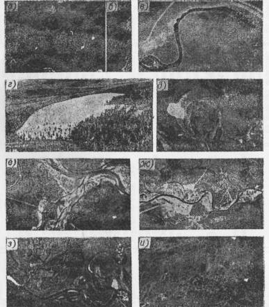Описание морфологических признаков, по которым типы руслового процесса опознаются непосредственно по снимкам, приведено в табл. 4. Свободное меандрирование на снимках разных масштабов непосредственно опознается по наличию излучин, находящихся на разных стадиях развития (от начальной слабой извилистости русла до конечной стадии развития излучины - петли перед прорывом ее перешейка) и присутствию на широкой пойме ранее спрямленных излучин - стариц [23]. Граница поймы наиболее четко выявляется в паводок, так как при затоплении и переувлажнении пойма выделяется черным или темно-серым тоном изображения при контрасте с более светлыми по тону изображения склонами долины. На мелкомасштабных ТВ-снимках в период паводка в зоне тундры (при отсутствии древесной растительности) выявляются малые реки за счет контраста между поймами (серый и темно-серый тон) и водосборами с угнетенной, еще не вегетирующей растительностью (светло-серый тон) просматривается извилистый рисунок краевых участков поймы, создаваемый врезом излучин в склон долины. По наличию этих признаков свободное меандрирование опознается даже на малых реках (рис. 1ж). На ТВ-снимках, полученных в низкую межень в тех же районах, из-за отсутствия тоновых контрастов ни пойма, ни русло даже на средних реках уже не выявляются. По мелкомасштабным снимкам обнаруживается чередование сужений и расширений долин и пойм. Наиболее четко они видны в период паводков и при затоплении речных водохранилищ (см. рис. 1и). Излучины, их форма с наибольшим контрастом выделяются на снимках разных масштабов в весенний период, когда снег на пойме растаял, а в русле и старицах сохранился лед (рис. 2а). Граница поймы в этот период может быть выявлена при наличии контраста между растительным покровом на пойме (травянистая или кустарниковая) и на склонах долины (темнохвойный древостой). Внутрирусловые образования (пляжи, гряды) скрыты подо льдом. На безлесных поймах рисунок русла четко выделяется и в период, когда русло до бровок заполнено водой - черный тон изображения, а безлесная пойма имеет светло-серый тон (см. рис. 1а). Анализ обширного материала аэрокосмических съемок позволяет сделать вывод о том, что во всех физико-географических зонах СССР свободно меандрирующее русло легко опознается непосредственно по снимкам, а выявляемые особенности обусловливаются местными геологическими и мерзлотно-геологическими особенностями и интенсивностью экзогенных процессов. Свободно меандрирующие реки особенно развиты на Западно-Сибирской равнине. Они имеют очень широкие поймы, малые уклоны продольного профиля; долины этих рек заложены в толще легко размываемых осадочных отложений. Многие реки от истоков до устья сохраняют свободно меандрирующее русло. Развитие излучин на широких поймах проходит определенные циклы. В начальной стадии развития при углах разворота не более 120° излучина сползает вниз по течению. При дальнейшем увеличении угла разворота сползание излучины приостанавливается, но ускоряется ее разворот. Развитие излучины завершается сближением подмываемых берегов выше и ниже расположенных смежных излучин, затем прорывом перешейка, переходом всего потока в прорыв и отмиранием спрямленной излучины [23]. На ТВ-снимках, например, прослеживаются излучины, находящиеся на разных стадиях развития 