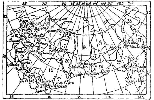 3. ИСТОЧНИКИ ПОЛУЧЕНИЯ ИНФОРМАЦИИКлиматические характеристики могут быть получены в указанных ниже изданиях. Строительная климатология и геофизика [3] содержит следующие материалы. Температура наружного воздуха по данным действующих метеорологических пунктов: - средняя по месяцам; - среднегодовая; - абсолютная минимальная; - абсолютно максимальная; - средняя максимальная наиболее жаркого месяца; - наиболее холодных суток обеспеченности 0,98 и 0,92*; - наиболее холодной пятидневки обеспеченностью 0,98 и 0,92*; - период со средней суточной температурой воздуха £ 8 °С и £ 10 °С с указанием продолжительности (сут) и средней температуры (°С); - средняя температура наиболее холодного периода; - продолжительность периода со среднесуточной температурой £ 0 °C (сут). * Температура воздуха наиболее холодных суток и наиболее холодной пятидневки обеспеченностью 0,98 следует принимать при проектировании особо ответственных объектов по согласованию с Госстроем. Приложение 1 содержит схематические карты распространения климатических и геофизических параметров на территории СССР: - распространение объемов снегопереноса за зиму, м3/м; - распространение мощности и строения толщи пород с отрицательной температурой (криогенной толщи); - глубины промерзания глинистых и суглинистых грунтов; - распространение карста; - лавиноопасных районов; - районов, подверженных оползневым процессам; - распространение просадочных лессовых грунтов; - селеопасных районов; - климатического районирования территории СССР для строительства (с указанием северной строительной климатической зоны). В приложении 2 приведена средняя и максимальная суточная амплитуда температуры наружного воздуха за каждый месяц по метеопунктам. В приложении 3 даны влажность наружного воздуха и осадки по данным метеопунктов; - упругость водного пара наружного воздуха по месяцам, гПА; - средняя месячная относительная влажность воздуха в 13 ч (%) наиболее холодного и наиболее жаркого месяцев; - количество осадков (мм) за год, жидких и смешанных за год и суточный максимум. Приложение 4 указывает направление и скорость ветра по метеопунктам за январь и июль; - повторяемость направлений ветра по 8 румбам, %; - средняя скорость ветра по 8 румбам, м/с; - повторяемость штилей, %; - максимальная из средних скоростей по румбам за январь; - минимальная из средних скоростей по румбам за июль; - приложения 5 - 7 содержат данные о солнечной радиации, поступающей в июле. Справочник по климату СССР (Л.: Гидрометеоиздат) состоит из 34 выпусков, составленных территориальными управлениями гидрометеорологической службы по региональному принципу (рис. 1). Каждый выпуск Справочника состоит из пяти частей, которые содержат характеристики отдельных элементов климата: часть I. Солнечная радиация, радиационный баланс и солнечное сияние; часть II. Температура воздуха и почвы; часть III. Ветер; часть IV. Влажность воздуха, атмосферные осадки и снежный покров; часть V. Облачность и атмосферные явления. По сравнению с Климатическим справочником СССР, издававшимся в 1940 - 1950 гг. Справочник по климату СССР дополнен большим количеством станций и таблиц вероятностей и некоторыми расчетными данными. При проектировании автомобильных дорог и мостовых переходов могут быть использованы данные, содержащиеся в частях II - V Справочника. В части II Справочник