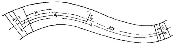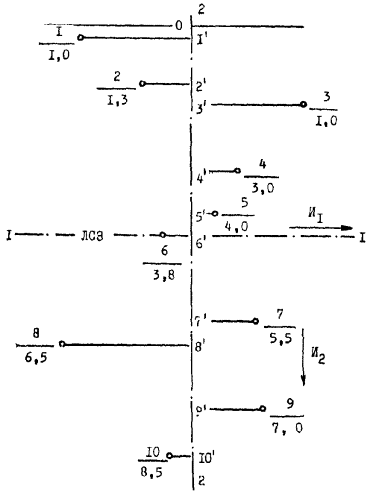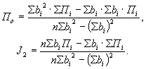 где П1 и П2 - средние значения параметра П на ключевых площадках; А - расстояние между площадками по ЛСЗ. Рис. 1. Схема полосы изменчивости параметра П инженерно-геологических объектов одного вида: I и II - ключевые площадки; И1 и И2 - взаимно перпендикулярные направления изменчивости; О1 и О2 - центральные точки ключевых площадок; ЛСЗ - линия средних значений параметра П; А - расстояние между центральными точками ключевых площадок; аx и вx - относительные координаты точки X Рис. 2. Схема ключевой площадки с планом информативных точек (скважин) Числитель - номер скважины, знаменатель - значения параметра П; 1′ - 10′ - проекции положения информативных точек на направление изменчивости И2 (2-2); за начало отсчета (0) принято пересечение прямой 2-2 с границей поля Среднее значение параметра П на удалении αx от первой ключевой площадки будет Расчетное значение параметра П в точке x, удаленной на расстояние (см. рис. 1) от ЛСЗ, определяют по формуле где J2x - градиент изменчивости по направлению И2 на расстоянии αx от первой ключевой площадки. Предположим, что величина градиента изменчивости по направлению И2 равномерно меняется от J21 на первой ключевой площадке до J22 на второй площадке, тогда модуль изменчивости градиента по И2 будет равен а значение градиента по направлению И2 на удалении αx от площадки I равно Градиенты изменчивости параметра и по направлению И2 вычисляют, исходя из частных значений параметра, полученных в точках наблюдения на ключевых площадках. 2.21. Градиент изменчивости по заданному направлению приближенно следует определять по способу средних градиентов (см. рис. 2). Точки 1-10 - места получения частных значений параметра П на ключевой площадке. 1-1 - линия средних значений - осевая полосы развития инженерно-геологических объектов, определяемых исследуемым параметром П, на которой наблюдается равномерное (линейное) изменение параметра П. Прямая 2-2, перпендикулярная ЛСЗ и параллельная направление изменчивости И2, наносится таким образом, чтобы справа и слева от нее оказалось бы приблизительно одинаковое количество точек определения частных значений параметра П (в частном случае точки 1-10 могут быть все размещены на 2-2 (поперечный профиль). Проектируя точки 1-10 на 2-2, получаем систему точек 11-101 на одной прямой. Частные градиенты изменчивости по направлению 2-2 имеют вид: где Пi и Пi+1 - частные значения параметра П в точках i и i+1, (bi+1 - bi) - расстояние между точками i и i+1. Тогда 2.22. Более точным методом определения градиента изменчивости по направлению 2-2, перпендикулярному ЛСЗ, является метод наименьших квадратов [11]. Предположив, что закономерное изменение параметра П по направлению 2-2 имеет линейный характер, получаем Пoi = J2 · b + Пo, (9) где Пoi - точное значение параметра П на удалении b от точки начала отсчета; Пo - усредненная величина параметра П в точке начала отсчета. Следовательно, (Пi - Пoi) - отклонение величины фактического параметра П от точного в любой i-й точке на направлении 2-2. Необходимо получить минимальное значение Σ(Пi - J2bi - Пo)2. В этом случае должны выполняться следующие соотношения: Если имеется n информативных точек, то уравнение (10) принимает вид n · Пo + J2 Σbi = ΣПi. (12) Так как ΣПo = nПo, уравнение (11) запишется как ПoΣbi + J2Σbi2 = ΣbiПi. (13) Решая эти уравнения как систему, получаем выражения для Пo и J2