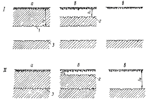 Рис. 1. Основные виды текстур мерзлых грунтов: а - массивная; б - слоистая; в - сетчатая 2. Определение глубины залегания вечномерзлых грунтовПоложение поверхности вечномерзлых грунтов устанавливается по данным инженерно-геологического обследования. В зависимости от условий ее залегания могут быть два основных случая: слой сезонно промерзающего грунта не сливается с вечномерзлым грунтом (несливающаяся мерзлота); сезонно оттаивающий слой при промерзании сливается с вечномерзлым грунтом (сливающаяся мерзлота). В первом случае между поверхностью вечномерзлого грунта и подошвой слоя сезонного промерзания имеется слой талого грунта (рис. 2), поэтому глубина скважин, достигающих поверхность вечномерзлого грунта, должна быть больше глубины сезонного промерзания на величину, равную мощности постоянно талого слоя. При сливающейся мерзлоте глубина залегания поверхности вечномерзлого грунта соответствует полной глубине сезонного оттаивания. Рис. 2. Наиболее характерное положение деятельного слоя: I - для сезонно промерзающего слоя (несливающаяся мерзлота) в периоды: а - максимального промерзания; б - промежуточный; в - максимального оттаивания; II - для сезонно оттаивающего слоя (сливающаяся мерзлота) в те же периоды. 1 - поверхность вечномерзлых грунтов; 2 - граница оттаивания; 3 - граница промерзания;