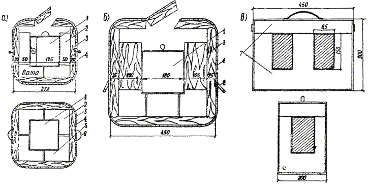 Таким образом, температура мерзлого грунта в районе Сковородино на глубине 4 м изменяется в пределах от -1,4 до -0,8°. 4. Отбор образцов, их хранение и транспортировкаДля отбора образцов мерзлых глинистых грунтов ненарушенной структуры наряду со специально заправленными ложками-кернобрателями рекомендуется применять грунтонос конструкции ЦНИИС (авторское свидетельство № 218783) (рис. 5). При подготовке к отбору образцов с грунтоноса снимают фиксирующее кольцо 5, корпус грунтоноса 1 отсоединяют от хвостовика 4. Затем в корпус грунтоноса устанавливают кассету с шестью кольцами для компрессионных или сдвиговых приборов, перед установкой которой внутреннюю поверхность корпуса смазывают техническим вазелином или солидолом. Для отбора образцов грунтонос опускают в скважину, вращая вручную по часовой стрелке до полного заглубления. Мерзлый грунт отрывают от забоя подсекающими ножами, для чего заглубленный грунтонос вращают против часовой стрелки до полного отрыва образца. Затем грунтонос извлекают из скважины, отсоединяют от хвостовика и из его корпуса вынимают кассету с образцом грунта. Для хранения и испытания отобранных образцов мерзлых грунтов при полевых работах в летний период на исследуемой территории необходимо оборудовать специальный шурф сечением 1,5´2 м, который должен пройти вечномерзлые грунты на глубину 2 - 2,5 м. Располагать шурф следует в затененное месте (в лесу) на глинистых грунтах, там, где наблюдается более низкая температура вечномерзлых грунтов и минимальная глубина сезонного протаивания. Шурф должен быть тщательно изолирован от внешних атмосферных воздействий. С этой целью рекомендуется применять двойное перекрытие шурфа: первое - на поверхности и второе - на границе с вечномерзлыми грунтами. В перекрытиях оборудуют люки для спуска в шурф. Верхнее перекрытие засыпают землей или закладывают дерном (мхом) и закрывают водонепроницаемым материалом - толем, рубероидом или брезентом. Отобранные из выработок образцы мерзлых грунтов доставляют в шурф-лабораторию. При транспортировке необходимо принимать меры по предотвращению их оттаивания. Для этой цели применяют термосы различных конструкций. Три типа таких термосов показаны на рис. 6, а, б, в. В термосе, показанном на рис. 6, а, размещаются четыре образца размерами 60´100´120 мм. Образцы в термосе этого типа могут сохраняться в течение 2 - 2,5 ч. Если термос обернуть мхом или другим изолирующим материалом, срок хранения и перевозки можно увеличить до 4 - 5 ч. Термос той же конструкции (см. рис. 6, б) большего размера служит для транспортировки мерзлых пород на значительные расстояния. В нем размещаются 10 - 12 образцов размерами 80´80´90 мм (при укладке в два яруса); в мерзлом состоянии они сохраняются в течение 6 - 8 ч, а при хорошей дополнительной упаковке - 10 - 12 ч. Рис. 5. Грунтонос для отбора образцов мерзлого грунта ненарушенной структуры конструкции ЦНИИС: 1 - корпус; 2 - обуривающая коронка; 3 - ножи для подрезки керна; 4 - хвостовик; 5 - пружинное фиксирующее кольцо; 6 - кассеты с кольцами для стандартных компрессионных и сдвиговых приборов Рис. 6. Термосы для транспортировки образцов мерзлого грунта: а - на 4 образца; б - на 12 образцов; в - на 2 образца; 1 - внутренний ящик из фанеры и досок; 2 - поддерживающие брусья; 3 - внешний ящик из досок; 4 - обшивка войлоком и брезентом; 5 - заполнитель (ват