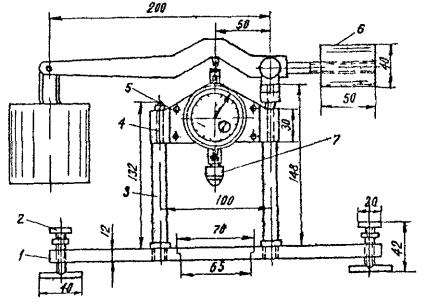 т.е. величина предельно длительного сопротивления сдвигу мерзлого грунта численно равна величине его предельно длительного сцепления, которая в половых условиях устанавливается в результате испытаний образцов грунта при постоянной отрицательной температуре методом шарикового штампа. Конструкция прибора, на котором проводятся испытания, может быть различной. Одна из применяемых конструкций показана на рис. 8. Рис. 8. Схема прибора для определения сцепления мерзлого грунта: 1 - опорная площадка; 2 - уравнительные винты; 3 - стойки; 4 - поперечина с вмонтированным в нее индикатором; 5 - стопорное приспособление; 6 - рычаг с контргрузом; 7 - подвижной стержень с шариковым штампом Во избежание оттаивания грунта под шариком температура прибора должна быть близка к температуре образцов. Для этого прибор необходимо выдержать вместе с образцами в холодильной камере в течение 2 - 3 ч. Поверхность образца мерзлого грунта перед испытаниями тщательно зачищают: с нее удаляют включения камней, остатки корней и т.п. Для предупреждения местных пластических деформаций, обусловленных плотностью контакта образца с опорной станиной, мерзлый грунт следует предварительно обжать с помощью жесткой пластинки давлением, по величине не меньшим, чем давление на штоке прибора при последующем испытании. Величина давления, которое следует приложить на площадку шарикового штампа, зависит от прочности мерзлого грунта. Общее погружение шарикового штампа в мерзлый грунт не должно превышать 0,1 его диаметра. При стандартном диаметре шарика, равном 14 мм, обычно прикладывается нагрузка от 5 до 10 кг. Глубину вдавливания стального шарика в мерзлый грунт определяют точными замерами. Величину сцепления вычисляют по формуле