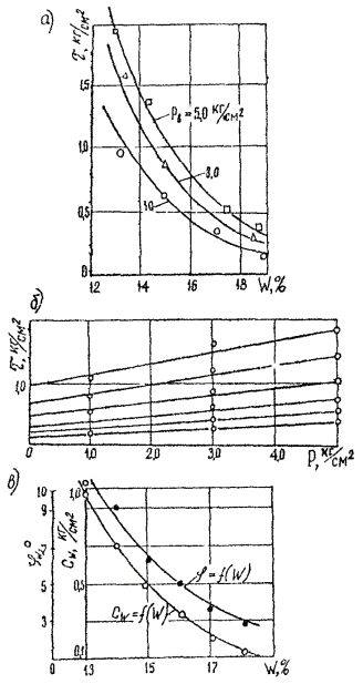 Рис. 10. Зависимость относительной деформации от нагрузки 8. Механические свойства грумов при оттаиванииСопротивление сдвигу оттаявшего грунта Сдвиговые характеристики с и φ определяются на обычных сдвиговых приборах сразу же после оттаивания вечномерзлого грунта, при этом особенности испытаний зависят от условий работы грунта и сооружения. При испытании грунтов, используемых для отсыпки насыпей, сопротивление сдвигу определяют по обычной методике на образцах с нарушенной структурой, влажность и плотность которых соответствуют нормативной плотности и влажности грунта в теле проектируемой насыпи. В тех случаях, когда сопротивление сдвигу определяют для грунтов основания или откосов выемок и грунты после оттаивания длительное время сохраняют естественную влажность вследствие плохих условий дренирования, испытания проводят на образцах грунта ненарушенной структуры по методике быстрого сдвига без предварительного уплотнения (незавершенное уплотнение). В большинстве случаев оттаявшие вечномерзлые глинистые грунты практически полностью водонасыщены. Вследствие этого при сдвиговых испытаниях под действием приложенной нагрузки влажность образцов этих грунтов может изменяться на величину, превышающую 2 - 3 % предусмотренную методикой обычных испытаний. Для получения сдвиговых характеристик, соответствующих начальной влажности образцов грунта, испытывают несколько образцов с различной влажностью под разными нормальными нагрузками. Нормальные нагрузки при сдвиге следует назначать через равные интервалы - от максимальной до нулевой с учетом реально действующих нагрузок. Под каждой выбранной нормальной нагрузкой производят сдвиг трех образцов с различной влажностью. Образцы различной влажности можно получить и испытать следующим образом: Каждый образец, предназначенный для сдвига, выдерживают под постоянной нормальной нагрузкой, под которой проводится сдвиг, в течение различного времени. В этом случае первый образец сдвигается сразу же после приложения заданной нормальной нагрузки, второй образец - после выдерживания его под данной нагрузкой до практически полного завершения консолидации. Оставшиеся образцы перед сдвигом выдерживаю под нагрузкой так, чтобы величина их влажности в момент сдвига имела промежуточное значение между величиной влажности первого и второго образцов. Образцы выдерживают в течение различного времени под постоянной большой нагрузкой. В этом случае испытывают по одному образцу, выдержанному в течение различного времени под каждой из принятых нормальных нагрузок. Образцы выдерживают до практически полной консолидации или в течение заданного времени под различными нагрузками, наибольшая из которых должна примерно вдвое превышать максимальную нормальную нагрузку при сдвиге. Часть образцов испытывают на сдвиг без предварительного уплотнения. После завершения предварительного уплотнения имеют образцы, не подвергавшиеся уплотнению с максимальной влажностью, максимально уплотненные с минимальной влажностью и образцы с промежуточной влажностью. Каждый из образцов грунта с одинаковой влажностью испытывают под одной из принятых нормальных нагрузок. Интенсивность приложения сдвигающей нагрузки рекомендуется назначать с таким расчетом, чтобы сдвиг образца происходил 