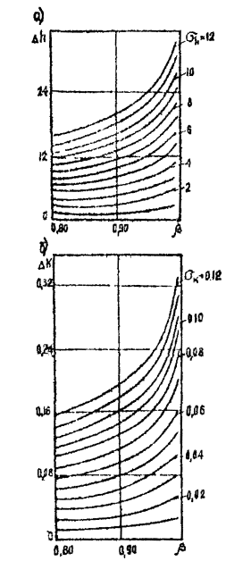 где Dh, Dk - соответственно отклонение величины пучения и коэффициента неравномерности от среднего значения, определяемые в зависимости от среднеквадратического отклонения sh и sk и заданной вероятности b по графикам на рис. 12. Рис. 12. Графики для определения возможных отклонений: а - величины пучения; б - коэффициента неравномерности пучения грунта в зависимости от заданной вероятности Вероятность, с которой следует определять пределы изменения величины пучения и его неравномерности, назначается в зависимости от чувствительности сооружения к деформации основания при пучении грунта. Пример расчета пределов изменения величины пучения и коэффициента его неравномерности с заданной вероятностью В