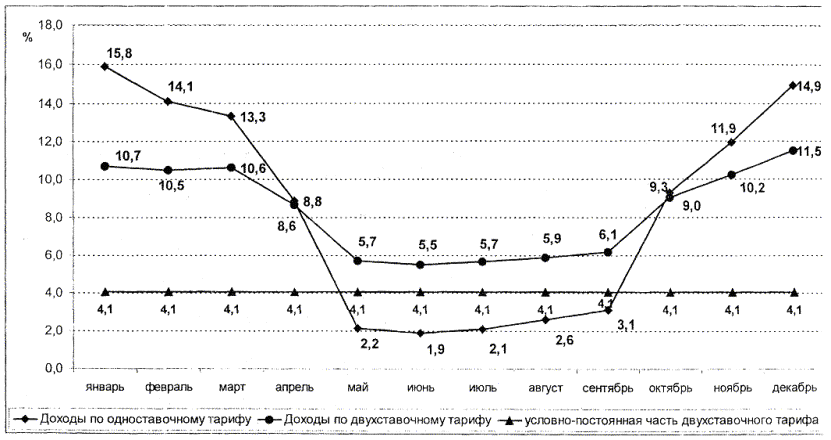 Рис. 1. Месячные доли поступления средств оплаты от годового объема реализации тепловой энергии. 7.10. Расчет оплаты для конкретного потребителя определим на следующем примере. Заявленная нагрузка составила 0,204 Гкал/ч. Соотношение между нагрузкой и реализацией (К1) составило 222 при среднем соотношении по группе потребителей (К2) 243,2. Таким образом, плата за заявленную нагрузку умножается на 0,91 (222/243,2) и потребление тепловой энергии потребителем характеризуется более полной загрузкой мощности, чем в среднем по данной группе потребителей, поэтому возможно снижение платы по сравнению с оплатой по одноставочному тарифу. Расчет показателей платы по двухставочному тарифу: