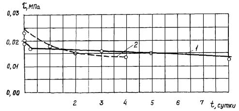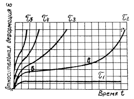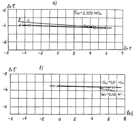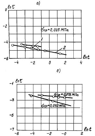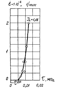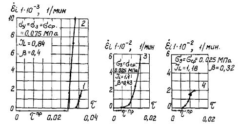 где F0 - начальная площадь поперечного сечения образца; ∆h/h = ε - относительная осевая деформация сжатия образца. Рис 1. Кривые ползучести при различных касательных напряжениях τ В ходе опыта осевую нагрузку на образец можно увеличивать с помощью рычага специальной конструкции. 3.6. Для построения кривых ползучести рекомендуется испытать серию образцов при заданном среднем нормальном напряжении при различных касательных напряжениях, составляющих 60, 70, 80, 90 % от касательного напряжения при быстром разрушении грунта в тех же условиях. В результате получают семейство кривых ползучести с различным временем до разрушения. При использовании теории течения твердого тела на основе кривых ползучести может быть построена зависимость между касательными напряжениями, вызывающими разрушение грунта, и соответствующим временем разрушения (рис. 2). Эта кривая носит название кривой длительной прочности. Точка кривой на ординате соответствует мгновенному загружению и называется мгновенной прочностью. За прочность в условиях ползучести принимается предел длительной прочности τдл = τпр. За предел длительной прочности принимают напряжения, при которых деформации затухают и разрушения не происходит. При использовании теории течения вязкопластических тел с начальным сцеплением на участке установившейся ползучести для каждой кривой ползучести определяют скорость деформации (п. 3.2), вычисляют интенсивность деформации или градиент скорости и строят кривую зависимости ε от τ на пределе разрушения (рис. 3). Участок τпр на оси касательных напряжений рекомендуется принимать за порог прочности или прочность в условиях ползучести. 3.7. С целью повышения экономической эффективности исследований за счет сокращения времени испытания и обеспечения возможности определения порога прочности неоднородных грунтов рекомендуется пользоваться методами: а) деформирования, который заключается в разрушении серии образцов грунта при различных постоянных скоростях деформирования в интервале от 4 до 0,01 мм/мин (рис. 4). Точка А - критерий разрушения. Порог прочности определяют по теории течения вязкопластических тел в соответствии с п. 3.6; б) медленного, ступенчатого приложения нагрузки на образец с выдержкой каждой ступени до условной стабилизации деформации. За условную стабилизацию принимается деформация, не превышающая 0,01 мм за 12 ч. Первая ступень нагрузки не должна составлять более 60 %, а каждая последующая ступень не должна увеличиваться более чем на 10 % от величины касательного напряжения при быстром разрушении (мгновенная прочность). За величину порога прочности τпр рекомендуется принимать касательное напряжение, соответствующее ступени нагрузки, предшествующей разрушению (точка А на кривых рис. 5). Метод применим только при условии сохранения определенного напряженно-деформированного состояния в течение всего опыта. Рис. 2. Зависимость касательного напряжения илов на пределе разрушения от времени при σз = 0,025 МПа: 1 - JL = 1,03, 2 - JL = 0,70 Рис. 3. Зависимость интенсивности касательных напряжении на пределе разрушения от градиента скорости деформирования искусственно подготовленных образцов из глинистого ила. Опыты проведены: 1 - под постоянной нагрузкой; 2, 3, 4 - с постоянной скоростью деформирования 3.8. Опыты на ползучесть и определение прочности рекоменду