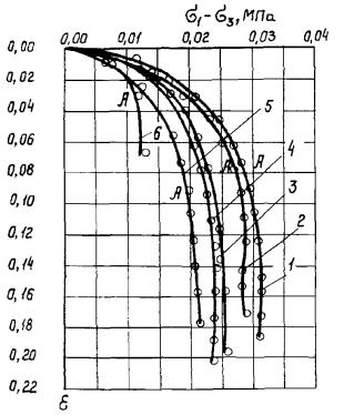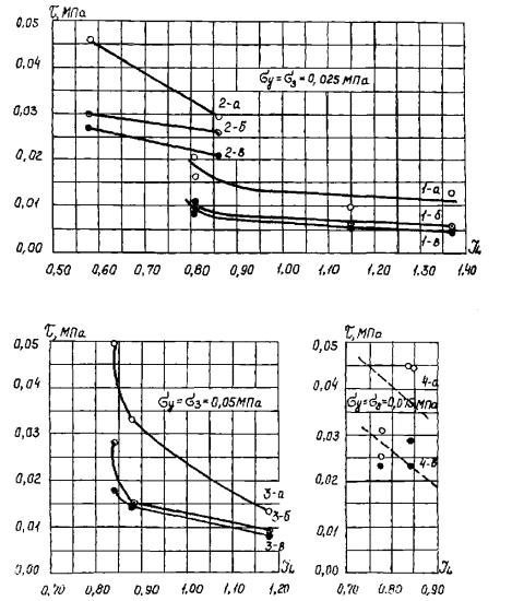 различных условиях разрушения (○ - быстрое; 1 - а, б, в - σу = σ3 = 0,025 МПа ср. данные по 25 опытам; 2 - а, б, в - σу = σ3 = 0,025 МПа ср. данные по 10 опытам; 3 - а, б, в - σу = σ3 = 0,05 МПа ср. данные по 17 опытам; 4 - а, в - σу = σ3 = 0,075 МПа ср. данные по 17 опытам Таблица 3