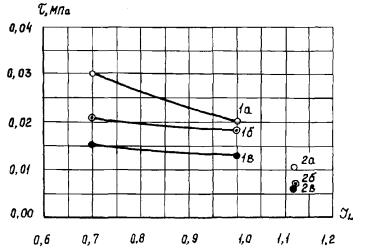 океана от консистенции JL, испытанных при различных условиях разрушения (○ - быстрое; 1а, б, в - σу = σ3 = 0,025 МПа (ср. данные по 15 опытам); 2а, б, в - σу = σ3 = 0,0175 МПа (ср. данные по 8 опытам) Таблица 4