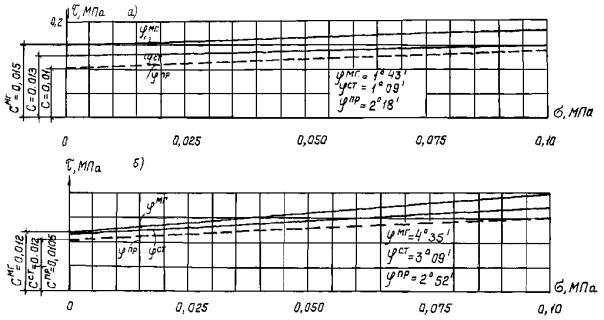 Прочность грунтов в условиях ползучести в производственных лабораториях можно определять в приборах трехосного сжатия на одном образце путем ступенчатого приложения вертикальной нагрузки с выдержкой каждой ступени до затухания деформаций (условная стабилизация деформации < 0,01 мм за 12 часов) при условии сохранения однородного напряженного состояния грунта в течение всего опыта. 5.2. Для определения параметров прочности глинистых грунтов малой степени литификации образцы, уплотненные заданным давлением, должны разрушаться в трехосном приборе не менее чем при трех средних нормальных напряжениях и при трех режимах загружения - быстром (мгновенная прочность), медленном (стандартная прочность), в условиях ползучести (порог прочности). Образцы могут быть разрушены при средних нормальных давлениях, меньших давления уплотнения, т.е. при консолидированном состоянии или при больших средних нормальных напряжениях, когда возникнет нестабилизированное состояние образца. Во втором случае для определения порога прочности можно пользоваться только способом деформирования образца с постоянной скоростью и испытание проводить по закрытой схеме. Скорость деформирования следует выбирать в интервале от 2 до 0,1 мм/мин (при высоте образца до 80 мм). Сравнительно быстрые испытания по закрытой схеме позволяют сохранить постоянное состояние образца в течение опыта. В качестве примера на рис. 12,а и б приведены огибающие к кругам Мора по испытаниям суглинка с искусственно сформированной структурой. Результаты обработаны по полным и эффективным напряжениям. 5.3. Количество опытов по определению прочности для каждого инженерно-геологического элемента устанавливается в соответствии с ГОСТ 20522-75*). *) Грунты. Метод статистической обработки результатов определений характеристик. М., Издательство стандартов, 1975. Рис. 12. Огибающие Мора, выраженные через полные (а) и через эффективные (б) напряжения по результатам неконсолидированно-недренированных испытаний образцов с искусственно сформированной структурой, подготовленных из суглинка (Jp = 12; JLср = 0,88; разрушение произведено при скоростях деформирования: φмг; cмг - 1 мм/мин; φст; cст - 0,1 мм/мин; φпр; cпр - в условиях ползучести) 5.4. Нормативные значения параметров прочности грунтов при всех режимах испытания следует вычислять по методу наименьших квадратов для всей совокупности опытных величин τ в инженерно-геологическом элементе в соответствии с п. 3.2 ГОСТ 20522-75 и с использованием рекомендаций Руководства. 5.5. Расчетные значения параметров прочности грунтов при всех режимах испытания следует определять в соответствии с п. 3.5 ГОСТ 20522-75. В качестве примера в табл. 5 приведены нормативные и расчетные значения параметров прочности, вычисленные по комплексным исследованиям 4х-метровой толщи илов в основании дамбы Днестровского лимана. Приведенные нормативные и расчетные значения параметров прочности илов, уплотненных давлением 0,05 МПа, соответствуют давлению от 5-метрового слоя песка, намытого для предпостроечной консолидации. Разрушение образцов произведено быстро по закрытой схеме при средних нормальных напряжениях 0,05; 0,075; 0,10 МПа. Порог прочности τпр определен при среднем нормальном напряжении 0,05 МПа, равном давлению уплотнения. Средняя нормативная величина τпр близка к расчетной величине τ при дове