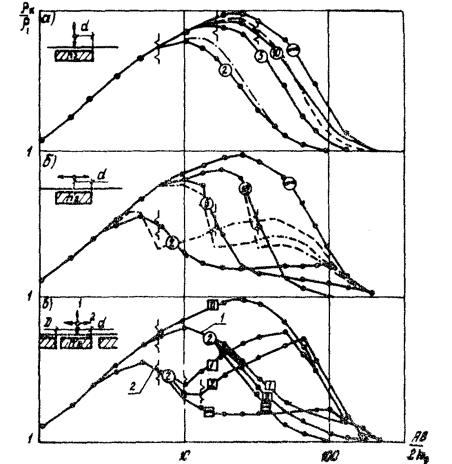 моделирования; ─ ─ ─ - графические кривые; 3.5. Боковое влияние мерзлых пород имеет место при зондировании на сквозных таликах. На рис. 2 показаны кривые, полученные путам моделирования на трехслойном разрезе [3]. При отсутствии мерзлых пород кривая ВЭЗ практически имела бы вид прямой. Боковое влияние мерзлых пород сказывается в плавном увеличении значений ρк и появлении максимума на кривых тем большего, чем ближе мерзлые породы к центру зондирования. При направлении разносов вкрест талика (а) искажения более значительные, чем при разносах вдоль талика (б). Рис. 2. Кривые ВЭЗ, полученные над моделью талика при боковом влиянии мерзлых пород (по С.А. Бойкову):