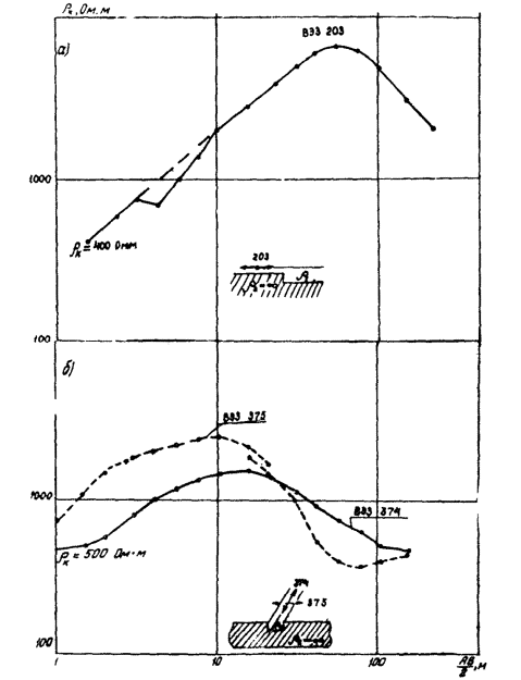 - линии разносов АВ вдоль талика; 2 - то же вкрест талика; При интерпретации подобных кривых возникают ошибки в определении глубины залегания кровли мерзлых пород и их мощности, а также в оценке разреза в целом. Наличие перегиба приводит к выделению в разрезе фиктивных слоев. Если искажения, обусловленные единичными уступами и впадинами, имеют четкий и локальный характер (рис. 4, а), то при перпендикулярной ориентировке оси установки к неровностям интерпретация кривой ВЭЗ не вызывает особых затруднений. Влияние неровностей кровли мерзлых пород может выразиться также в изменении формы кривых ВЭЗ. На рис. 4, б приведены такие полевые кривые крестового зондирования, полученные для случая узкого несквозного талика. Здесь при интерпретации более достоверные данные о мощности мерзлых пород и мощности трещиноватых и обводненных зон были получены по кривой ВЭЗ 375, снятой при направлении разносов вкрест талика. Рис. 4. Кривые ВЭЗ, иллюстрирующие влияние неровностей рельефа кровли мерзлых пород: а - над единичным уступом; б - над узким несквозным таликом 3.7. Весьма трудно интерпретировать кривые ВЭЗ, полученные в условиях узких протяженных или замкнутых таликов небольшой площади. В этих условиях метод ВЭЗ можно использовать только для разделения таликов на сквозные и несквозные. Для этой цели следует применять крестовые зондирования. 3.8. При качественном анализе кривых прежде всего рассматривают кривые ВЭЗ, полученные в центральных частях исследуемых участков, характеризующихся, с наибольшей вероятностью, горизонтальной однородностью и отсутствием образований, обусловливающих боковые влияния. Особое внимание должно быть уделено отбору параметрических кривых, отличающихся высокой надежностью, поскольку данные их интерпретации являются основой для истолкования всего массива кривых. Из кривых ВЭЗ, полученных на каждом участке, сначала отбирают и анализируют кривые крестовых, а затем круговых симметричных и трехполюсных ВЭЗ для определения имеющихся боковых влияний и их характера. Для этого сравнивают упомянутые кривые с кривыми, полученными на участках с однородным строением разреза, а также между собой. 3.9. При зондировании нередко наблюдаются существенные различия значений ρк при переходе с одной приемной линии на другую. Эти различия обусловливаются горизонтальной неоднородностью разреза в связи с изменением состава, влажности, льдистости пород и глубины залегания кровли мерзлых пород, наличием негоризонтальных границ раздела мерзлых и талых пород. Не рекомендуется простое осреднение кривых ρк в интервале перекрытия, поскольку оно часто приводит к значительному изменению крутизны ветвей кривых ВЭЗ, появлению дополнительных перегибов. Параллельный сдвиг кривых до их совпадения в интервале перекрытия в целом позволяет получить кривую, интерпретация которой дает меньшие погрешности при определении мощности слоев, но приводит к неправильной оценке величины УЭС отдельных слоев разреза. Последнее недопустимо, когда абсолютная величина УЭС служит критерием обводненности, трещиноватости пород и т.п. В этих случаях при наличии больших разрывов в величинах ρк значения УЭС выделенных геоэлектрических слоев устанавливают по соответствующим отрезкам кривых ВЭЗ до их совмещения. 3.10. Количественную интерпретацию начин