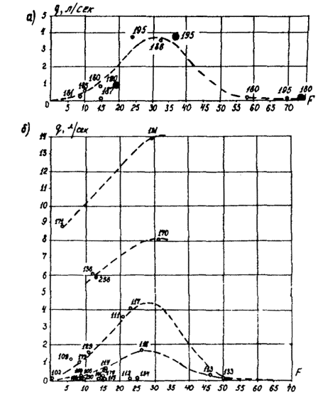 Минимум, выраженный слабее, наблюдается при разносах 150 - 200 м. На кривой ρк эти минимумы фиксируются менее четко, в особенности последний. В силу большой изрезанности кривые ρt трудно поддаются палеточной интерпретации, но они дают более точное представление о характере изменения геоэлектрического разреза. По форме кривой ρt можно установить тип геоэлектрического разреза и, следовательно, более точно произвести количественную интерпретацию. 3.19. Информацию о наличии трещиноватости в скальных массивах и преобладающем направлении получают по результатам круговых ВЭЗ. Установлено, что экзогамная трещиноватость в верхней части скального массива и зоны мерзлотного выветривания характеризуется коэффициентом кажущейся анизотропии ξ ≤ 1,4. Трещиноватость в зонах тектонических нарушений более ориентирована и характеризуется значениями ξ ≥ 1,5. 3.20. Важным параметром для оценки водообильности пород является относительное сопротивление F. На рис. 7, а показано распределение величины F в зависимости от изменения удельного дебита скважин в гранитоидах протерозойского возраста. Совокупность точек F аппроксимируется кривой нормального распределения случайных величин с максимумом, соответствующим наиболее обводненным породам. Согласно характеру распределения водообильность гранитов и гранодиоритов постепенно увеличивается при изменении F от 5 до 30. Затем наблюдается спад водообильности, и при значениях F более 50 породы являются практически безводными. На благоприятные условия (водообильность) указывают значения в пределах между 10 и 45, что соответствует удельным сопротивлениям обводненных пород от 1000 до 3500 Ом·м при удельном сопротивлении подземных вод равном 80 Ом·м. В указанных пределах сопротивления пород в наибольшей мере зависят от водонасыщения трещиноватых зон. Таким образом, величина относительного сопротивления может быть использована как поисковый критерий. Однако оценка водообильности водоносных горизонтов по параметру F имеет приближенный характер. Это обусловлено прежде всего несопоставимостью данных об удельном дебите скважин, так как в них не учтена мощность водоносных горизонтов, а также большой неоднородностью обводненных пород, представленных чередованием крепких безводных и трещиноватых обводненных слоев, которые на кривых ВЭЗ выделяются как единый мощный водоносный горизонт. В зависимости от количественного соотношения мощностей этих слоев, условий и формы их залегания при одной и той же водоносности горизонтов, по данным ВЭЗ могут быть получены различные величины их удельных сопротивлений. Рис. 7. Распределение величин относительного сопротивления F обводненных гранитоидов протерозойского (а) и юрского (б) возрастов в зависимости от удельного дебита скважин q на центральном участке трассы БАМ: ¡ - по данным ВЭЗ; ¤ - по данным каротажа; цифры у точек - номера скважин В районах распространения гранитоидов более молодого юрского возраста зависимость F от q выражена слабее (рис. 7, б). Одним и тем же значениям F могут соответствовать как сильно, так и слабо обводненные породы. Это можно объяснить эквивалентным воздействием на электропроводность интрузивных пород, как их обводненности, так и наличия глинистого заполнителя по трещинам. В некоторых случаях аномально низкие сопротивления могут быть обус