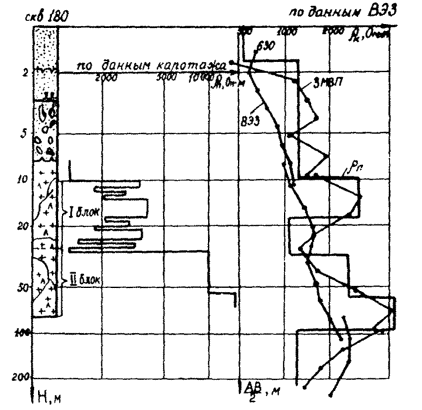 разрез по скважине. Кривые ВЭЗ имеют тип КН. Элемент К отражает наличие