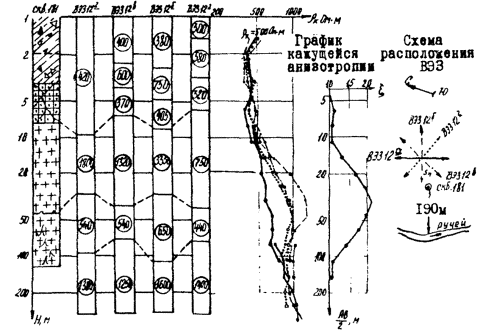 трещиноватости пород наблюдается при разносах Рис. 16. Кривые круговых ВЭЗ и график кажущейся анизотропии, полученные у скважины № 262: