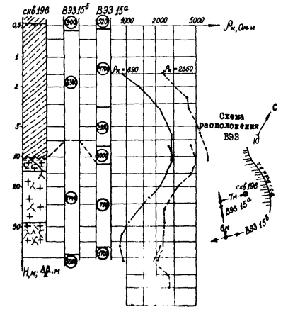 ВСЕСОЮЗНЫЙ МЕТОДИЧЕСКИЕ РЕКОМЕНДАЦИИ Одобрены Главтранспроектом МОСКВА 1978 ПРЕДИСЛОВИЕ Снабжение водой населенных пунктов Байкало-Амурской магистрали представляет собой важную и сложную задачу. Для поисков и разведки подземных вод выполняется большой объем гидрогеологических изысканий, в комплекс которых входят и электроразведочные работы. В настоящих Рекомендациях рассматриваются вопросы методики проведения полевых работ и интерпретации получаемых данных по одному из ведущих методов - вертикальному электрическому зондированию (ВЭЗ). Рекомендации разработаны на основе результатов опытно-производственных работ, проведенных лабораторией инженерной геологии и геофизики ЦНИИС при участии Мосгипротранса, изучения литературных источников и опыта применения геофизических методов на трассе БАМ. В разработке Рекомендаций участвовали инженеры В.Я. Пригода и В.С. Буркин, канд. техн. наук А.М. Горелик (ЦНИИС), канд. геол.-минералог. наук В.С. Бабин, инж. В.С. Беляев (Мосгипротранс), канд. геол.-минералог. наук С.А. Бойков и инж. Б.П. Петрухин (МГУ). Работа предназначена для геофизиков и гидрогеологов проектно-изыскательских институтов. Зам. директора института Н.Б. СОКОЛОВ Руководитель отделения изысканий и проектирования железных дорог А.М. КОЗЛОВ 1. ОБЩИЕ ПОЛОЖЕНИЯ1.1. По генетическим признакам и условиям циркуляции подземные воды районов трассы БАМ подразделяются на следующие типы: 1) трещинные и трещинно-жильные воды скальных массивов; 2) пластово-поровые воды артезианских бассейнов; 3) воды четвертичных и аллювиальных отложений. По отношению к многолетнемерзлым породам подземные воды подразделяются на надмерзлотные, межмерзлотные и подмерзлотные [1]. Режим каждого типа вод зависит от положения их в мерзлотно-геологическом разрезе. 1.2. Надмерзлотные и межмерзлотные воды верхнего переходного горизонта с локальными таликами, заглубленными в мерзлые породы, обладают свободной поверхностью. Напор приобретается во время сезонного промерзания верхней части разреза (криогенный напор) в случае, когда мерзлые породы в виде «надвига» или «козырька» располагаются над талыми водоносными породами, или в других частных случаях. Режим этих вод в течение года сильно меняется. Запасы в зимнее время сокращаются до минимальных. Наиболее значительные запасы подземных вод сосредоточены в долинах рек, где они могут быть использованы для небольших водозаборов. 1.3. Межмерзлотные воды залегают между верхней и нижней границами мерзлых пород; к ним относятся также воды сквозных таликов, служащих путями разгрузки и питания подмерзлотных горизонтов. Приурочены они обычно к зонам тектонического дробления скальных массивов, обладают большими динамическими запасами и являются надежными источниками водоснабжения. 1.4. Подмерзлотные, а также подмерзлотно-межмерзлотные воды развивающихся вверх таликов образуют один водоносный горизонт, залегающий непосредственно под нижней границей вечной мерзлоты. В скальных массивах воды этого горизонта приурочены к зонам повышенной подмерзлотной трещиноватости, образовавшейся в результате вековых колебаний климата и связанных с ними многократными наступлениями и отступлениями мерзлоты, а также к зонам тектонических разломов и контактам пород различного петрографического состава. Подмерзлотные трещино