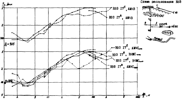 Пример бокового влияния талых пород на результаты электрометрических измерений показан на рис. 13. На кривой симметричного ВЭЗ 17б, выполненного вкрест долины ручья, при разносах питающей линии 8 - 10 и 25 - 45 м наблюдается нарушение плавности в форме кривой кажущихся сопротивлений, вызванной боковыми влияниями. Как известно, определить по данным симметричного ВЭЗ, с какой стороны от точки наблюдений расположено аномальное тело, обуславливающее это нарушение, не представляется возможным. По геоморфологическим признакам можно предположить, что искажение вызвано наличием подруслового талика. Результаты крестового трехполюсного ВЭЗ позволяют совершенно однозначно установить, что проводящее тело, обуславливающее искажающее боковое влияние на результаты зондирований, находится на линии раскосов ВЭЗ 17б, АМNC ∞ в 25 - 45 м восточнее точки наблюдений, у подошвы надпойменной террасы. Следовательно, данные круговых двухсторонних трехполюсных ВЭЗ по сравнению с данными симметричного зондирования позволяют с большей уверенностью установить факт искажения кривых, а также определить, с какой стороны и на каком расстоянии от точки наблюдения располагается геологическое тело, обуславливающее это искажение. По линии разносов ВЭЗ 17б искажения, очевидно, связаны либо с наличием мощного слоя глин у подошвы надпойменной террасы, либо с существованием сквозного талика в рыхлых отложениях. Формальная интерпретация искаженных одиночных кривых симметричного или трехполюсного ВЭЗ привела бы к выявлению в толще гранитов на глубине 25 - 45 м ложной аномалии пониженных сопротивлений, которую можно истолковать, как зону сильно разрушенных обводненных пород. Поэтому при поисках подземных вод особенно важно выявлять и отбраковывать подобного рода аномалии. Результаты геофизических исследований и данные опытных откачек разведочных гидрогеологических скважин по рассмотренным участкам приведены в таблице. Рис. 13. Пример бокового влияния талых пород на результаты симметричного (АМNВ) и трехполюсного (АМNC ∞) ВЭЗ