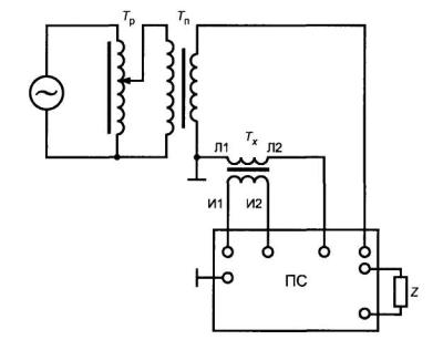 ~ - сеть (генератор); Тр - регулирующее устройство (автотрансформатор); Тп - понижающий силовой трансформатор; Тх - поверяемый трансформатор тока; Л1, Л2 - контактные зажимы первичной обмотки, И1, И2 - контактные зажимы вторичной обмотки; Z - нагрузка; ПС - прибор сравнения типа К-535 Рисунок 2 - Схема поверки с использованием компаратора первичного и вторичного токов