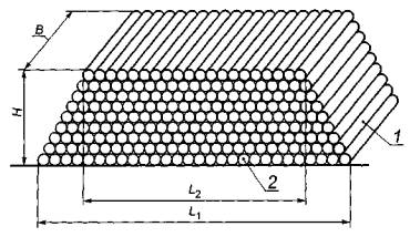 где hiп - высота i-й секции с торцевой передней стороны, м; п - число секций; hi3 - высота i-й секции с торцевой задней стороны, м; i - порядковый номер секции (i изменяется от 1 до n). Ширину штабеля В, сформированного на складе, принимают равной номинальной длине сортиментов, установленной в технических документах или в договорах на поставку (без припусков). Ширину штабеля В измеряют в метрах с округлением результата до второго знака после запятой. Длину штабеля L, сформированного на складе, измеряют вдоль обеих (передней и задней) торцевых сторон штабеля с вычислением среднего значения. Для этого с каждой стороны штабеля измеряют длину оснований L1 и L2 по крайним бревнам нижнего ряда и длину штабеля L'1 и L'2 по крайним бревнам верхнего ряда. Среднее значение длины штабеля вычисляют по формуле