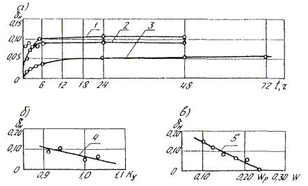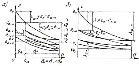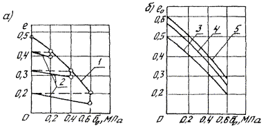 где ek - конечное значение коэффициента пористости при наступлении упругой компрессии. Примечание. Для решения уравнения (24) испытано 3 вида лессовидных суглинков, отобранных с разных объектов строительства. Первый - делювиальный лессовидный суглинок (район ст. Кандагач), второй - пролювиальный лессовидный суглинок (IV надпойменная эрозионная терраса р. Чирчик у г. Ташкента), третий - аллювиально-пролювиальный лессовый суглинок предгорной пологонаклонной равнины (район Алма-Ата). Результаты всех экспериментов подвергнуты многофакторному корреляционно-регрессионному анализу с использованием ЭВМ. Уравнения регрессии имеют вид: λа-н = 1,356 - 1,904ен - 2,520σа - 6,079Ip + 0,627e2н - 0,661σ2а + 3,167eнσа + 15,115σIp, λ1 = 1,243 - 1,628ен - 2,341σо - 5,981Ip + 0,712e2н - 0,789σ2о + 3,124eнσо + 10,842σIp, λр = 0,128 - 4,813Ip + 26,307I2p + 0,562σ2p - 0,359σpIp - 0,000196σpeн. Приведенные уравнения регрессии вполне надежны: действительно, критерии Стьюдента для коэффициентов указанных уравнений лежат в пределах 5,10-15,54 при табулированном значении 2 (достоверная вероятность 0,95). Критерий Фишера, который должен быть больше 1,4, находится в пределах 8,6-10. Множественный коэффициент корреляции для уравнений составляет 0,94-0,96, а его критерий значимости - 78,6-64,4 при табулированном значении 2. Данные уравнения определены на основании 59 испытаний, в которых аргументы изменялись в следующих границах: 0,13 ≥ Ip ≥ 0,06 0,8 МПа ≥ σ ≥ 0,2 МПа 0,80 ≥ е ≥ 0,50 На рис. 15, а приведена комплексная характеристика упругой компрессии лессовидного суглинка, а на рис. 15, б номограмма eo = f(σo). Рис. 15. Комплексная характеристика упругой компрессии лессовидного суглинка (а) и номограмма для определения плотности, обеспечивающей упругую работу насыпей из суглинков (б): 1 - eo = f(σo); 2 - eу = f(σo); 3, 4, 5 - соответственно Ip = 0,07; 0,13; 0,17 3.73. Уплотнение грунтов вплоть до коэффициента пористости eo обеспечивает безосадочность насыпей. Но следует иметь в виду, что в ряде случаев достижение ео невозможно, технически сложно или экономически нерационально. В данном случае можно ограничить остаточные деформации допустимым пределом, предусмотрев соответствующий запас на осадку насыпи по высоте или ширине ее. При этом возникнут дополнительные расходы как строительные, так и эксплуатационные. Поэтому вопрос назначения рациональной степени уплотнения необходимо решать на основе технико-экономического сравнения возможных вариантов и перспективного развития рабочих параметров пути. Осадка S слоя насыпи толщиной hi без учета бокового расширения грунта будет