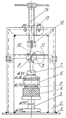 Рис. 6. Тарировочные кривые: а - зависимость деформации прибора Δтар нагрузки; б - то же от времени в полулогарифмическом масштабе при P = 0,05 МПа; в - зависимость нагрузки на днище прибора P от нагрузки на его поршень P 3.37. Силу трения образца грунта о режущее кольцо определяют по разности нагрузок, приложенных к образцу через поршень и воспринятых днищем прибора. Измерение этих нагрузок осуществляют образцовыми динамометрами. Для измерения силы трения кольцо с грунтом помещают на пористую пластинку, надевают цилиндр, направляющее кольцо со штампом. Динамометр помещают между станиной пресса и пористой пластинкой. Нагрузку передают через рычаг, как обычно. После опыта строят тарировочную прямую в координатах нагрузка на днище прибора - нагрузка на поршень (см. рис. 6, в). Для передачи на образец грунта внешней нагрузки последняя должна быть увеличена на коэффициент, равный тангенсу угла наклона тарировочной кривой к оси абсцисс. В частности, для прямой, изображенной на рис. 6, в, указанный коэффициент равен 0,89. Это означает, что внешнюю нагрузку следует увеличить на 11 %. 3.38. Для тарирования усилия, которое передается на поршень прибора через систему рычагов, необходимо вместо прибора под пресс поместить образцовый динамометр ДС-0,2 или ДС-0,5. Внешнюю нагрузку следует откорректировать в зависимости от показаний динамометра. 3.39. Режущее кольцо прибора тарируют для правильного определения плотности грунта методом режущего кольца. Перед опытом кольцо взвешивают с точностью 0,01 г, высоту и диаметр измеряют штангенциркулем с точностью 0,1 мм в пяти точках. К расчету принимают среднеарифметические значения. 3.40. Относительное сжатие лессовых грунтов определяют обычными методами [33, 34, 32]. Как правило, по мере уплотнения грунта его сопротивление деформациям растет, поэтому следует постепенно увеличивать ступени давления при нагружении образца в одометре, причем пористость грунта от каждой ступени давления должна уменьшаться одинаково. При полулогарифмическом графике компрессии это условие приводит к увеличению давления на грунт следующим образом: 0,01-0,025-0,05-0,1-0,2-0,4 МПа [22]. Особое вникание следует уделять тщательности вырезания колец из монолита грунта. Для этих целей рекомендуется специальный пресс, разработанный в ЦНИИСе (рис. 7). К стальной станине 1 приварен П-образный швеллер 2, к которому сверху прикрепляют двумя болтами бронзовую втулку 13 с резьбой. Втулка служит для передачи давления от винтового пресса 14 на стальной шарик 12, предназначенный для центрирования вертикального усилия и трансформации вращательного движения пресса в поступательное. Поперечный швеллер 11 прикреплен к П-образному швеллеру 2. Поперечина увеличивает жесткость конструкции и служит для прикрепления к ней бронзовой направляющий втулки 8, в которой свободно, но без раскачивания ходит бронзовый шток 10. Шток обеспечивает задавливание кольца 5 без перекосов в монолит 4. Шток закрепляют во втулке 8 барашком 9. На шток навинчивают вкладыш 7, который на 55 мм плотно вводит в насадку 6, обеспечивая строго вертикальное перемещение кольца. Монолит грунта устанавливают на чугунную подставку 3. Имея 2-3 типоразмера штока 10 и подставки 3, можно работать с монолитами разной величины и кольцами для сдвиговых, трехосных и других приборов. Рис. 7. Пресс для вырезания колец из монолитов