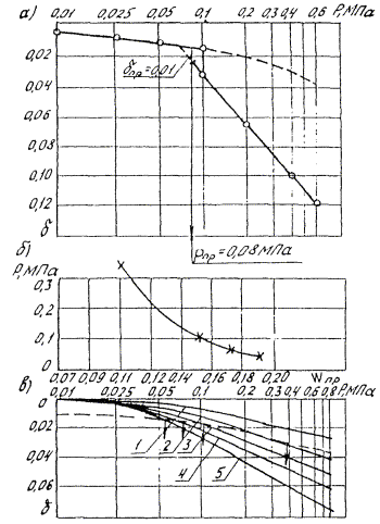 где h1 - высота образца грунта с природной влажностью при заданном давлении; hпр - высота образца после просадки в результате замачивания; hн - начальная высота образца, т.е. высота кольца; Δhδ - абсолютное сжатие образца с природной влажностью при природном давлении; коэффициент просадочности δ′пр = Δhпр / (hн - Δh), (16) где Δh - уменьшение высоты образца грунта; начальное просадочное давление, т.е. минимальное давление, при котором проявляются просадочные свойства грунта в условиях его полного водонасыщения; за величину Pпр принимают давление, соответствующее при компрессионных испытаниях относительной просадочности δпр = 0,01; определение начального просадочного давления по методу одной кривой приведено на рис. 8, а; начальную просадочную влажность, при которой грунты, находящиеся в напряженном состоянии от внешней нагрузки или собственного веса, начинают проявлять просадочные свойства. Определять начальную просадочную влажность следует при медленном повышении влажности просадочного грунта, вызываемом нарушением природных условий испарения, и постепенном накоплении влаги при инфильтрации в грунт поверхностных вод. При компрессионном сжатии величину Wпр вычисляют следующий образец. Из монолита грунта вырезают 5-6 колец. Один образец испытывают при естественной влажности We до заданного давления и при этом давлении замачивают, другой - сначала полностью насыщают водой, а затем нагружают теми же ступенями давления, что и первый. Остальные образцы испытывают при промежуточных значениях влажности. По полученным данным строят зависимости δ = f(P) при различных значениях влажности (см. рис. 8, б). На этот график наносят параллельно кривой сжатия грунта при естественной влажности кривую, соответствующую δпр = 0,01. Полученные точки пересечения указанной кривой с другими кривыми переносят на график P-W. Таким образом получают зависимость Wпр = f(P). Рис. 8. Определение начального просадочного давления (а) и начальной просадочной влажности (б, в) по результатам компрессионных испытаний: 1 - W = 0,07; 2, 3, 4, 5 - соответственно W = 0,112; 0,151; 0,174; 0,185 3.45. Испытание лессов на просадочность рекомендуется производить по методу одной кривой под нормативным давлением. Метод же двух кривых, как правило, не моделирует работу грунта в основании и теле земляных сооружений, и при его применении трудно получить идентичные по своим свойствам два образца лессов. Однако статистическая обработка более пятисот параллельных испытаний лессов двумя методами не позволила выявить значимых различий в результатах, получаемых по обоим методам. Так, отношение дисперсий в значениях степени просадочности при нагрузке 0,2 МПа (критерии Фишера) оказалось незначимым при пятипроцентном уровне значимости. Следовательно, методом двух кривых можно пользоваться при ускоренных испытаниях. 3.46. Существенное влияние на просадочность лессовых грунтов оказывает состав воды, заливаемой в одометр. Заливку следует производить водой, близкой по солевому составу той, которая увлажнит грунт в природных условиях. В противном случае можно получить ошибку в определении просадочности 35-40 %. 3.47. Если найденные для сопоставления величины относительной просадочности по методу двух кривых не совпадают на графике δ = f(P), т.е. просадка при замачивании под последней нагрузкой образца грунта естественной влаж