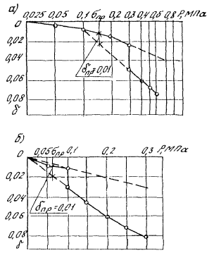 где δ′пр - относительная просадочность при замачивании образца естественной влажности на последней ступени нагрузки; δ″пр - относительная просадочность при том же давлении, определенная методом двух кривых. Если сопоставляемые значения δпр отличаются менее чем в 1,1 раза, то принимается среднее арифметическое значение из сравниваемых величин. При расхождении результатов более чем в 2 раза испытания бракуют. 3.48. В качестве упрощенного метода определения относительной просадочности рекомендуется несколько модифицированный метод ДИИТа [22, 38], основанный на том, что после замачивания образца лессов и стабилизации просадочных деформаций дальнейшее сжатие водонасыщенного грунта носит логарифмический характер (рис. 9, а). Грунт обжимают при природной влажности ступенями давления до 0,3 МПа. Под нагрузкой 0,3 МПа образец замачивают (монолиты, отобранные с больших глубин, замачивают под бытовой нагрузкой). После стабилизации просадки продолжают нагружение ступенями по 0,1 МПа до давления 0,6 МПа. По результатам испытаний строят график относительного сжатия грунта от логарифма P. Участок компрессионной кривой от 0,3 до 0,6 МПа аппроксимируют прямой (в случае необходимости методом наименьших квадратов). Прямую продолжают влево (к меньшим нагрузкам) до пересечения с кривой компрессии грунта природной влажности. Ордината δпр = 0,01 показывает начальное просадочное давлений, а ординаты между двумя кривыми - относительную просадочность. Рис. 9. Упрощенные методы компрессионного определения просадочности лессовых грунтов: а - предлагаемый; б - по методу В. И. Крутова Для непросадочных или просадочных лессов с высокой начальной влажностью пересечение начального участка компрессионной кривой с экстраполируемым наблюдается не всегда. В данном случае рекомендуется результаты испытаний обрабатывать по методу В. И. Крутова [15-17]. По этому методу испытывают также один образец, но график просадочности строит в обычных координатах. Затем плавной кривой экстраполируют кривые сжатия сухого и водонасыщенного грунтов (см. рис. 9, б) [7]. 3.49. По результатам испытаний засоленных просадочных грунтов методом одной кривой с длительным замачиванием строят график дополнительного относительного сжатия грунта во времени под воздействием замачивания δ = f(lnt). На этом графике выделяют участки просадки грунта и после просадочного уплотнения. Относительное послепросадочное уплотнение рассчитывают по формуле