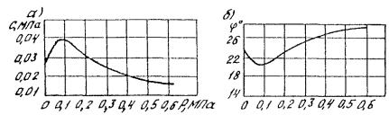 где h″ - высота образца грунта после длительного замачивания и стабилизации послепросадочного уплотнения (0,01 мм за 5 суток, но при испытании не менее чем за 15 суток). При этом следует определять содержание солей в грунте до и после компрессионных испытаний. 3.50. В случае набухания грунта, замачиваемого до начала загружения, вычисляют свободное относительное набухание как отношение прироста высоты образца к его начальной высоте. Значение δн откладывают на графике δ = f(P) вверх по оси ординат. 3.51. Если необходимо рассчитать ход осадки лессовых грунтов во времени, рекомендуется провести консолидационные испытания. Для получения консолидационных характеристик применяют стандартные компрессионные приборы. Для решения задачи одномерного уплотнения глинистых грунтов необходимо из опыта установить [43]: относительную компрессионную деформацию ползучести скелета грунта при единичной нагрузке (меру ползучести); зависимость напряжение - относительная компрессионная деформация ползучести скелета; целесообразность использования той или иной теории ползучести для описания этого процесса. Указанные закономерности следует определять на семейства кривых ползучести, полученных испытанием «образцов-близнецов» (при двустороннем отжатии поровой воды) постоянными нагрузками разной величины. Для проверки теории ползучести пару «образцов-близнецов» испытывают при возрастающих во времени ступенях нагрузок. Длительность испытания грунта на ползучесть обусловливается полной стабилизацией длительных осадок (отсутствие роста деформаций в течение недели). Отсчеты по индикаторам рекомендуется записывать в момент приложения нагрузки (t Во время опыта результаты регистрации деформации во времени рекомендуется изображать в виде зависимости относительной деформации от времени (при данной нагрузке) в полулогарифмическом масштабе. Переход процесса сжатия от первичной ко вторичной компрессии определяют моментом времени, начиная с которого экспериментальные точки устойчиво укладываются на прямую. 3.52. В зависимости от величины активной пористости, состава, степени влажности и других факторов сжимаемость лессов неодинакова. Наибольшее различие существует между лессами и тяжелыми лессовидными суглинками и глинами, коэффициент сжимаемости которых более чем в 2 раза ниже. Просадочные породы более сжимаемы по сравнению с породами с частично деградированной структурой. В диапазоне нагрузок 0-0,3 МПа коэффициент сжимаемости последних составляет соответственно 0,56-0,72 и 0,15-0,28 МПа-1. Для непросадочных древнечетвертичных лессовых пород, скифских глин и отложений подов коэффициент сжимаемости равен 0,09-0,17 МПа-1. Модуль деформации лессовых пород, определенный при штамповых испытаниях, колеблется от 2,3 до 52 МПа. Большие значения его характерны для пород с влажностью менее 0,17-0,18. При влажности 0,20-0,25 модуль деформации менее 15 МПа, при влажности более 0,08 - менее 4,5-5 МПа [5]. Условия, влияющие на просадочность, разнообразны. Наибольшей просадочностью обладают лессовые породы водоразделов и высоких надпойменных террас. В понижениях рельефа (низких террасах, выработанных балках, западинах) просадки слабо выражены или отсутствуют. С увеличением высоты местности в горах при уположении склонов просадочность лессовых пород уменьшается. Сдвиговые испытани