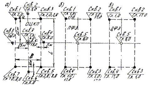 Признак 2 соблюдается, так как коэффициенты вариации не превышают значений, указанных в ГОСТ 20522-75 [19]. Признак 3 соблюдается, так как плотность призабойных образцов из всех монолитов выше, чем образцов из верхней и средней частей. Это свидетельствует о некотором уплотнении грунтов в призабойной части, которое вызвано технологией отбора монолитов способом «свободного» падения. Наконец, и признак 4 также соблюдается. Соблюдение всех условий и признаков ненарушенности сложения грунта монолитов позволяет утверждать о высоком качестве образцов 1, 2, 3. Однако монолит 4, несмотря на отсутствие видимых нарушений его сложения, может приниматься к лабораторным испытаниям только как образец нарушенного сложения. Так, из табл. 2 видно, что в этом случае не соблюдаются сразу два признака - 3 и 4. Этот образец был отобран с нарушением оптимальной технологии. Высота сбрасывания бурового снаряда составила 3,5 м, а высота монолита превысила 200 мм, т.е. монолит вошел в часть грунтоноса (удлинитель), предназначенную для сбора шлама. Приложение 2РАЗМЕЩЕНИЕ ТОЧЕК ОПРОБОВАНИЯ ПРИ ПОМОЩИ ФАКТОРНЫХ ПЛАНОВНиже изложены основные положения методики размещения точек опробования и методики планирования. При опробовании грунтов на участке трассы длиной 1 км планирование двухфакторного (глубина и длина) ортогонального центрального композиционного плана (ОЦКП) приводит к необходимости проходки трех скважин (ГК 1, ГК 6, ГК 11) с отбором монолитов грунтов на скв. 1 (ГК 1) с глубины 2, 5, 8 м; скв. 2 (ГК 6) - 2, 5, 8 и 16 м (контрольная точка) и скв. 3 (ГК 11) - 2, 5, 8 м. При этом известно, что изменение просадочности лессовой толщи до глубины 10 м носит параболический характер, а ниже - прямолинейный или δпр = const. Подобный характер изменения просадочности имеет место во многих районах Украины. При опробовании грунтов на площадке размером L × B = 100 × 50 м (рисунок) на стадии инженерно-геологической съемки достаточно спланировать полный факторный эксперимент (ПФЭ) и пройти скважины по углам площадки. На стадии инженерно-геологической разведки ПФЭ дополняют до ОЦКП и получают план разведки, указанной на рисунке, а. В этом случае необходимо пройти 9 скважин, отобрать: 15 + 1 (контрольный) = 16 монолитов грунта и произвести 8 × 4 + 6 × 3 + 1 × 5 + 1 × 3 = 56 испытаний на просадочность. Для сравнения укажем, что по рекомендациям [15] в этом случае необходимо пройти 4 скважины и отобрать монолиты через 2 м, т.е. 36 монолитов. При использовании ОЦКП математическую модель выбирают в виде δпр = a0 + a1h + a2B + a3L + a4h2 + a5B2 +a6L2 + a7hB + a8hL + a9BL, где ai - коэффициенты уравнения регрессии. Если известно, что изменение относительной просадочности в трехмерном пространстве имеет строго линейный характер (просадочная толща подстилается галечниками), то в этом случае достаточна реализация дробного факторного эксперимента (см. рисунок, в) с проходкой 4 + 1 (контрольная) = 5 скважин и отбором 4 + 1 (контрольный с гл. 9 м) = 5 монолитов грунта. В этом случае математическая модель имеет вид δпр = a0 + a1h + a2B + a3L.