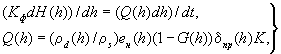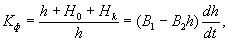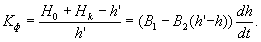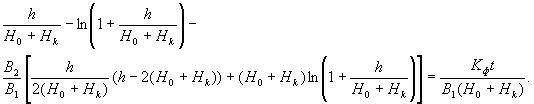 где Hk - напор капиллярного вакуума на фронте замачивания, B1 = (ρd / ρs)eн (1 - G) - B0 - a0q; B2 = a0ρsatq. Решение (4) при h(0) = 0 имеет вид При B1 = 0, т.е. при отсутствии просадочности на фронте замачивания это решение совпадает с решением, полученным П. Я. Полубариновой-Кочиной (1977 г.) для деформируемой пористой среды. Если происходит капиллярное замачивание слоя толщиной h′ снизу вверх вследствие капиллярного поднятия уровня грунтовых вод в подстилающем слое, тогда уравнение (4) принимает вид