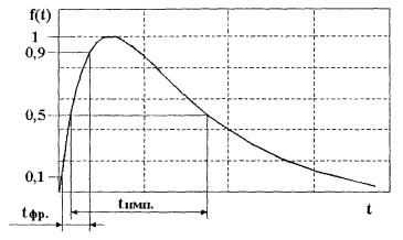 Приложение 3Методика определения амплитудно-временных параметров ИЭМП1. Для определения амплитудно-временных параметров ИЭМП производится анализ графического изображения импульса (осциллограммы напряженности электрической или магнитной составляющей ИЭМП), полученного в результате проведенных измерений с использованием осциллографа (рис. П.3.1). Рис. П.3.1. Пример функции изменения напряженности составляющих ИЭМП во времени. 2. На осциллограмме выделяется пик с наибольшим амплитудным значением напряженности ИЭМП, по которому определяются основные нормируемые и контролируемые параметры ИЭМП: Емакс [кВ/м] - максимальное амплитудное значение напряженности; tфр [нс] - длительность фронта импульса, которая определяется как интервал времени между первыми достижениями значений напряженности электрической (магнитной) составляющей ИЭМП уровней 10 % и 90 % максимального амплитудного значения; tимп [нс] - длительность импульса, которая определяется как интервал времени между первым достижением значения напряженности электрической (магнитной) составляющей ИЭМП уровня 50 % амплитуды и моментом времени, после которого значение напряженности электрической (магнитной) составляющей ИЭМП становится меньше 50 % максимального амплитудного значения. 3. Значение напряженности электрической составляющей ЭМП в динамике времени измерения - E(t) определяется из соотношения: E(t) = Емакс´f(t), где Емакс - амплитудное значение электрической составляющей электромагнитного поля; f(t) - функция изменения напряженности составляющих ЭМП во времени, составляющая для 10, 50 и 90 % максимального амплитудного значения соответственно 0,1; 0,5 и 0,9 (рис. П.3.1). 4. В случае проведения контроля интенсивности ИЭМП по напряженности магнитной составляющей, для дальнейшей оценки электромагнитной обстановки на соответствие ПДУ ИЭМП, производится пересчет полученных величин в значения напряженности электрической составляющей ИЭМП по следующей формуле: E(t) [В/м] = 377´H(t) [А/м], где E(t) - функция напряженности электрической составляющей от времени (t), H(t) - функция напряженности магнитной составляющей от времени (t), 377 - волновое сопротивление свободного пространства [Ом]. 5. Пример определения амплитудно-временных параметров ИЭМП и соответствия измеренной напряженности ПДУ. 5.1. При проведении измерений на рабочем месте персонала РТО ИЭМП получена осциллограмма, представленная на рис. П.3.2. Рис. П.3.2. Пример осциллограммы напряженности электрической составляющей ИЭМП. 5.2. Первый пик на осциллограмме имеет амплитуду (Емакс) 8 кВ/м, второй - 2,3 кВ/м. Следовательно, определять параметры необходимо по первому положительному пику: Емакс = 8 кВ/м; tфр = 13 нс; tимп = 62 нс 5.3. С учетом категории облучаемого контингента (персонал РТО ИЭМП) значение ПДУ ИЭМП следует определять согласно п. 2.4. настоящих санитарных правил по прилож. 1. 5.4. Исходя из установленных длительностей фронта и импульса воздействующего ИЭМП (tфр = 13 нс; tимп = 62 нс), выбираются соответствующие строка и колонка в прилож. 1 со значением ПДУ. В данном примере Епду = 2,8 В/м. Реальное значение Емакс составляет 8 кВ/м, что значительно больше, чем ПДУ. 5.5. Заключение: электромагнитная обстановка на обследованном рабочем месте персонала РТО ИЭМП не соответствует требованиям настоящих санитарных правил. Для снижения амплитудного значения напряженности И