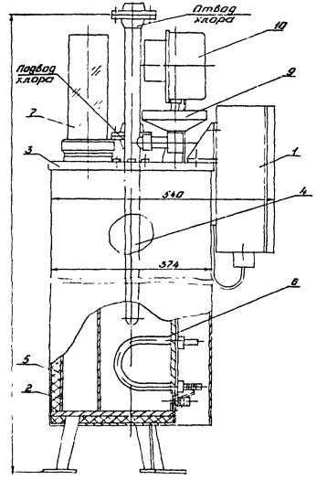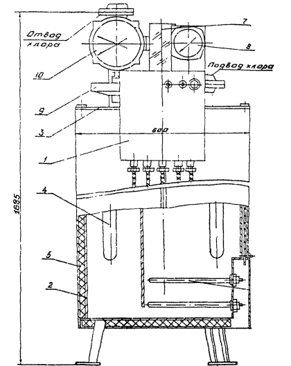 Теплообменник представляет согнутую из трубы конструкцию U-образной формы. К прямым участкам трубы с каждой стороны приварены по два фланца для крепления теплообменника к крышке и для присоединения его к трубопроводам подачи и отвода хлора и штуцер, к которому через угольник крепятся разделитель 9 и электроконтактный манометр 10.