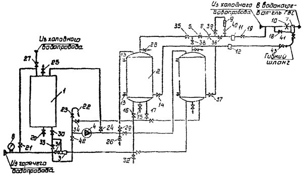 66. Расход рабочего раствора стекла жидкого натриевого определяется по количеству холодной воды с помощью ротаметра 9, для чего через несколько часов после пуска установки в эксплуатацию открыть вентили 39 и 40, а вентиль 36 закрыть. Записать показание ротаметра 9, открыть вентиль 36 и закрыть вентили 39 и 40. Эту операцию наиболее целесообразно проводить в утренние или вечерние часы, т.е. в периоды наибольшего разбора воды.