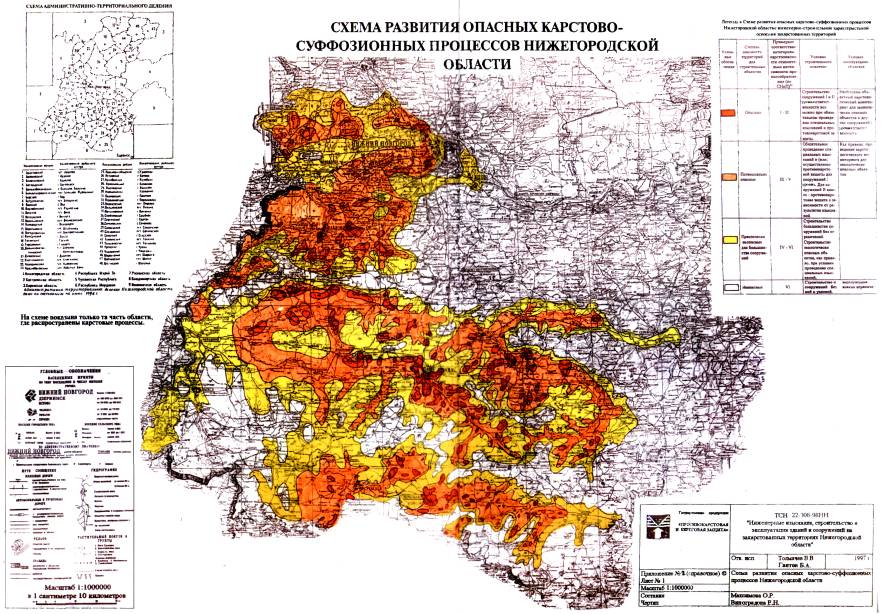 4. ГЕОЭКОЛОГИЧЕСКИЕ АСПЕКТЫ КАРСТОВЫХ ПРОЦЕССОВ В НИЖЕГОРОДСКОЙ ОБЛАСТИ4.1. При хозяйственном освоении закарстованных территорий следует учитывать следующие геоэкологические аспекты: I. Карстовый и особенно карстово-суффозионный процессы в значительной мере чувствительны к различным техногенным воздействиям. II. В карстовых районах более интенсивно, чем в других районах (при прочих равных условиях), происходит загрязнение геологической среды. III. В случае расположения на закарстованной территории экологически опасных объектов возможно возникновение экологических катастроф и бедствий. 4.2. Первый аспект. Анализ практики хозяйственного освоения закарстованных территорий в Нижегородской области показал, что интенсивность карстового и карстово-суффозионного процессов при техногенных воздействиях изменяется в той или иной степени за счет следующих факторов: - изменение скорости растворения карстующихся пород; - повышение скорости подземной эрозии (вынос заполнителя из карстовых полостей и трещиноватых зон); - повышение нагрузки на кровлю полостей; - создание условий для развития процессов суффозии или ее ускорения; - создание условий для возникновения разжижения водонасыщенных песков; - изменение физико-механических характеристик грунтов. Техногенные воздействия, активизирующие карстовый и карстово-суффозионный процессы, различаются по характеру, площади и времени воздействия: 4.2.1. По характеру воздействия: - увеличение статических напряжений в грунте; - передача динамических (вибродинамических) воздействий на грунт; - изменение уровня надкарстовых вод; - изменение уровня, в т.ч. пьезометрического, трещинно-карстовых вод; - увеличение скоростей движения подземных вод; - изменение химического состава подземных вод; - изменение температуры подземных вод; - изменение физико-механических характеристик грунтов вследствие химического загрязнения; - нарушение водоупорных слоев грунта. 4.2.2. По площади воздействия: - в пределах района, города (несколько квадратных километров); - в пределах микрорайона, промпредприятия (гектары, кв. км); - в пределах одного сооружения или нескольких сооружений (сотни квадратных метров, гектары). 4.2.3. По времени воздействия: - практически постоянные (продолжительность воздействия соизмерима со сроком службы сооружения); - долговременные (продолжительностью от одного года до нескольких лет); - краткосрочные (продолжительностью до одного года). 4.2.4. По периоду воздействия: - в период изысканий (например, бурение скважин); - в период строительства сооружения (например, забивка свай); - в период эксплуатации сооружения (например, утечка воды из коммуникаций). 4.2.5. Один и тот же вид хозяйственной деятельности может по-разному влиять на карстовый процесс. Применительно к конкретным инженерно-геологическим и хозяйственным условиям необходимо проводить специальный (хотя бы на качественном уровне) анализ влияния конкретных техногенных воздействий на активизацию карстового или карстово-суффозионного процесса. Наиболее характерными видами техногенных воздействий, влияющих на активизацию карстовых процессов в Нижегородской области, являются следующие: - дополнительное статическое давление на грунт от сооружений; - утечки воды из водонесущих коммуникаций, в том числе химически загрязненной и повышенной 