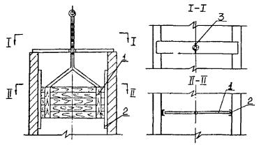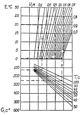 где W - затраты энергии и смесителе, Вт·с; η - вязкость воды, Па-с; T - время пребывания воды в смесителе, с; V - объем смесителя, м3. Величина G, характеризуя интенсивность перемешивания, отражает возможность контактов между собой частиц в объеме перемешиваемой воды и разрушения образовавшихся хлопьев и поэтому влияет на такие показатели хлопьев, как их плотность, объемная концентрация и распределение по размеру. Не являясь исчерпывающей характеристикой режима перемешивания, величина G может быть успешно использована для ориентировочного сопоставления работы различных смесителей и для характеристики режимов перемешивания в конкретном смесителе. 22. При контактном осветлении оптимальная интенсивность быстрого перемешивания коагулянта с водой (после его распределения в объеме очищаемой воды) зависит от качества обрабатываемой воды и продолжительности перемешивания и находится в диапазоне значений среднего градиента скорости 100 - 250 с-1. Точное определение оптимальных режимов перемешивания на стадии проектирования невозможно. В связи с этим необходимо предусматривать возможность регулирования интенсивности перемешивания для подбора условий, соответствующих наибольшей эффективности очистки воды методом контактного осветления. 23. Регулирование интенсивности перемешивания реагента с водой может осуществляться либо в механических смесителях (мешалки с регулируемым электроприводом), либо в гидравлических смесителях. Поскольку механические смесители практически не используются на коммунальных водопроводах, в настоящих рекомендациях приведены уточненные данные по проектированию перегородчатых смесителей, располагаемых во входных камерах станции контактного осветления. Большинство действующих станций контактного осветления оборудовано смесителями с дырчатыми перегородками. Дырчатые смесители не обеспечивают необходимых условий перемешивания коагулянта с водой, поэтому они исключены из действующего СНиП 2.04.02-84 и не используются при новом проектировании. При необходимости интенсификации действующих сооружений рекомендуется переоборудование дырчатых смесителей в перегородчатые. 24. В гидравлических смесителях величина затрачиваемой на перемешивание энергии определяется потерей напора. Мощность N потока с расходом Q может быть определена по формуле N = gρQH, (5) где g - ускорение свободного падания, равное 9,8 м/с2; ρ - плотность воды, кг/м3 (ρ = 1000); Q - расход воды, м3/с; H - потеря напора в смесителе, м. Так как N = W/T и V = QT, расчет среднего градиента скорости может быть произведен по формуле (6): При вычислении значения G по формуле (6) следует учитывать изменение вязкости воды при изменении ее температуры. На рис. 3 представлена номограмма, составленная по формуле (6), с помощью которой можно определить величину G по заданным значениям H и T в зависимости от температуры воды, а также величину H, необходимую для обеспечения заданной величины G. 25. Регулирование интенсивности перемешивания в гидравлическом смесителе следует производить путем изменения величины потери напора в нем. Рекомендуется применение гидравлических смесителей с перегородками, имеющими проемы, которые обеспечивают вертикальное давление воды с поворотами на 180° (рис. 4). Для осуществления регулирования интенсивности перемешивания перегородчатые смесители д