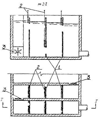 определяют максимальную площадь проема в перегородке (соответствующую максимальному перекрытию шиберами) fмин = Q/υ; определяют площадь одного отделения смесителя f0 = F/(n + 1) м2; определяют скорость вертикального движения воды в смесителе υв = Q/f м/с; определяют максимальную площадь проема в перегородке (соответствующую полному открытию проема) из условия fмин = Q/υмин; по формуле (7) определяют потери напора в смесителе при водном открытии проемов и по номограмме (см. рис. 3) оценивают величину среднего градиента скорости; подбирают габариты смесителя, перегородок и шиберов из условия, чтобы расстояния между перегородками были не менее 0,7 м. Пример 2. Рассчитать перегородчатый смеситель для станции контактного осветления производительностью 100000 м3/сут (2063 м3/ч). В соответствии с рекомендациями СНиП 2.04.02-84 следует предусмотреть не менее двух смесителей. Соответственно расчетный расход равен 1042,5 м3/ч (34,7 м3/мин = 0,58 м3/с). Объем смесителя V при времени пребывания в нем воды T = 1,5 мин равен V = QT = 34,7 × 1,5 = 52,05 м3. При высоте слоя воды в смесителе h = 4,5 м (соответствующей слою воды во входной камере) площадь смесителя в плане F равна F = V/h = 52,05 : 4,5 = 11,57 м2. При значении G = 250 с-1, времени пребывания воды в смесителе 1,5 мин и температуре воды 0,1 °С (по номограмме на рис. 3) необходимая величина потери напора в смесителе составит 1 м. При установке в смесителе 7 перегородок необходимая потеря напора в одной перегородке составит 0,143 м. При максимальном перекрытии проема максимальная скорость потока воды в проеме